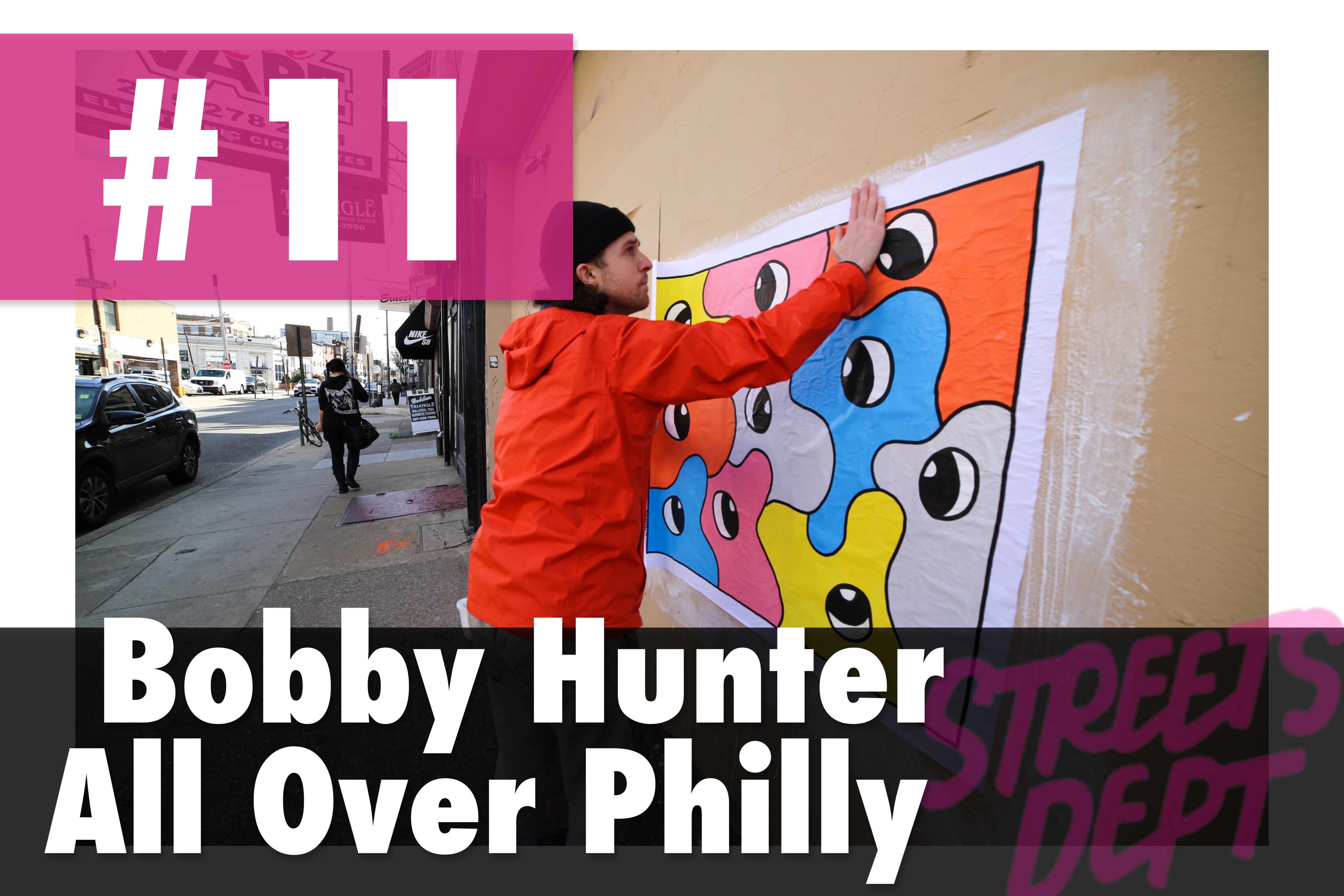 In March, we documented a South Street wheatpaste installation from the Bridesburg born-and-raised self taught artist, Bobby Hunter–and chances are good you’ve seen his work around Philly this year too. That’s because Bobby has, in classic street art form, got up (nearly) everywhere this year. After running this blog for nearly 12 years, its always fun to see new artists come in and excitedly paste the town! And Bobby’s style is so cheery and playful, it’s hard not to feel that joy yourself when you come across one of his installations.