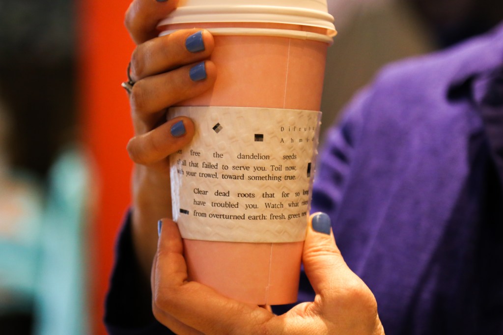 The poets were game to bring their work literally into the hands of the public, understanding that poems on coffee sleeves can be an entry point into the world of poetry. There is also a QR code on the sleeves for people to learn more about each poet on Elixr’s website.