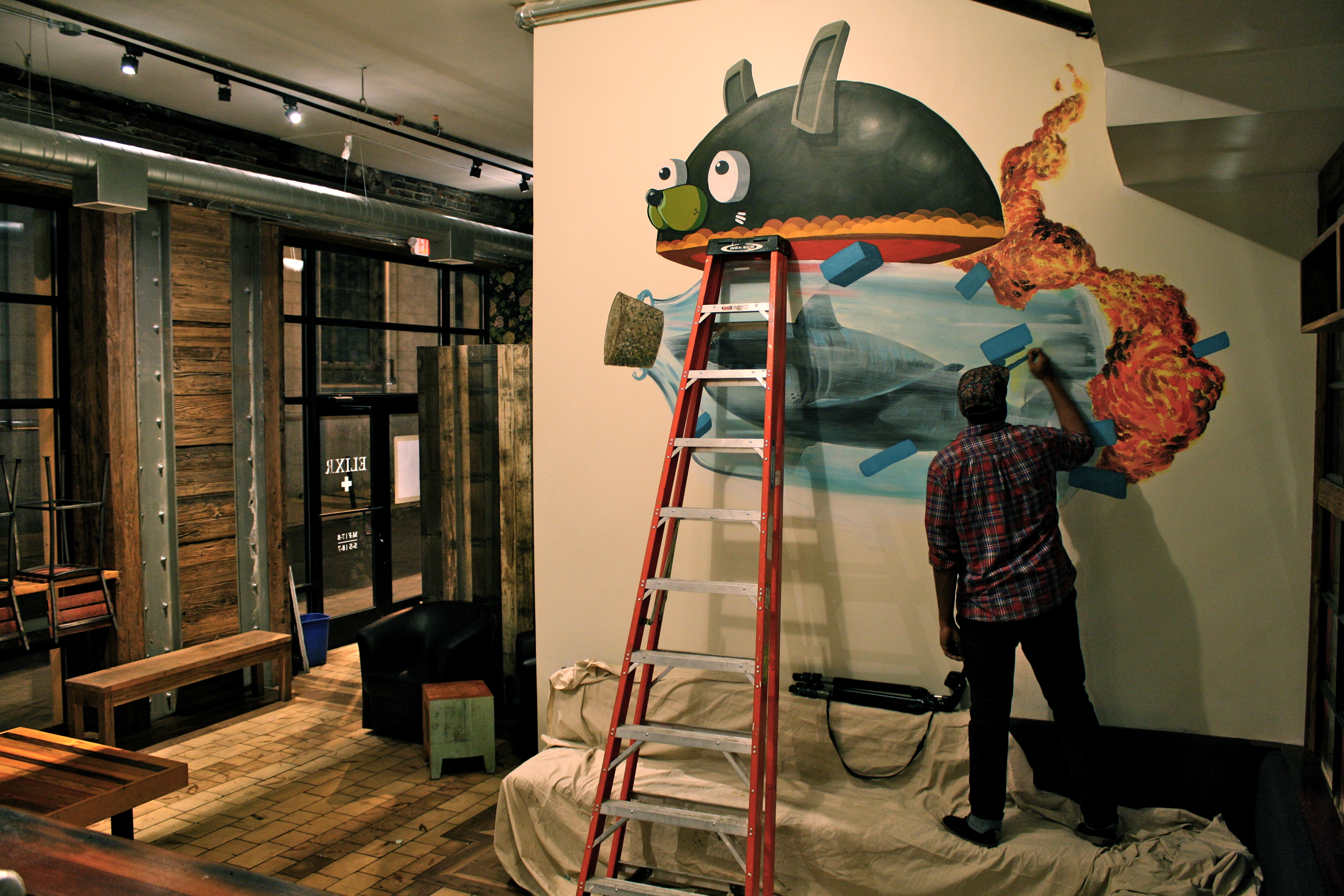 Ryan: Oh my goodness. Very hard to single out any one project. Well…there is nothing like your first project. Ours was working with NoseGo (Yis Goodwin) on a commission for what is now affectionately referred to as “Elixr’s mural wall.” My younger and less experienced self had aspirations of extending the program to do murals outside the building so that we had artwork both inside and out but didn’t quite now how to make that happen! During one late night of painting, Yis got very excited by the prospect of doing both an indoor and outdoor mural for the opening of the program, and we went to the property owner the next day to ask for permission. At the time, small businesses in Philly weren’t working commissioning artists this way, and the project took flight! Until the pandemic, we’d rotate these walls, commissioning 5-6 new works each year by different artists.