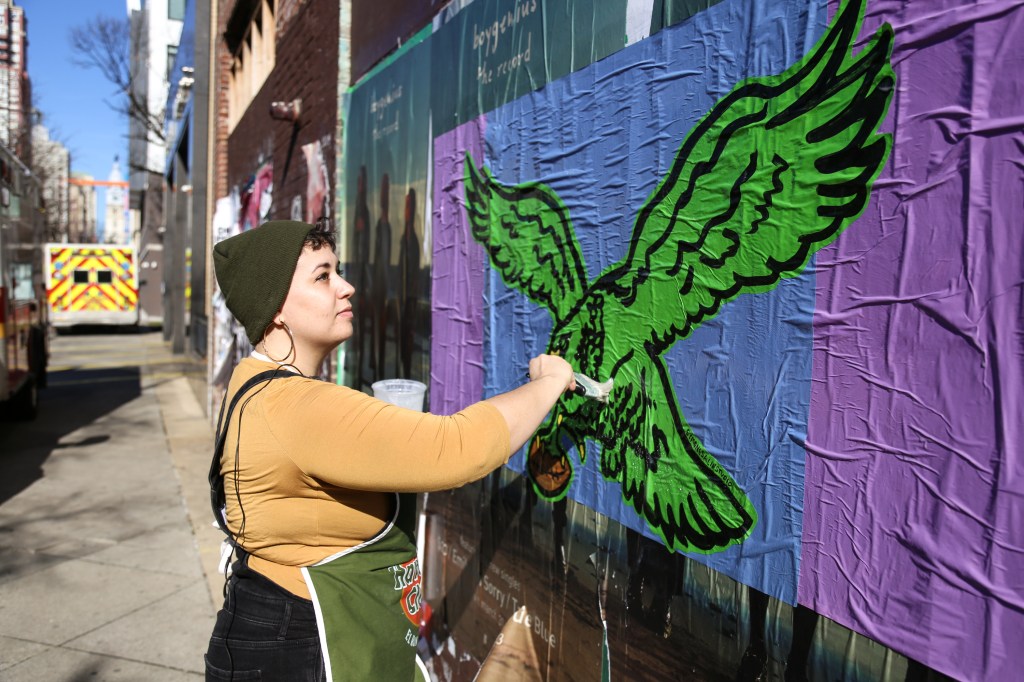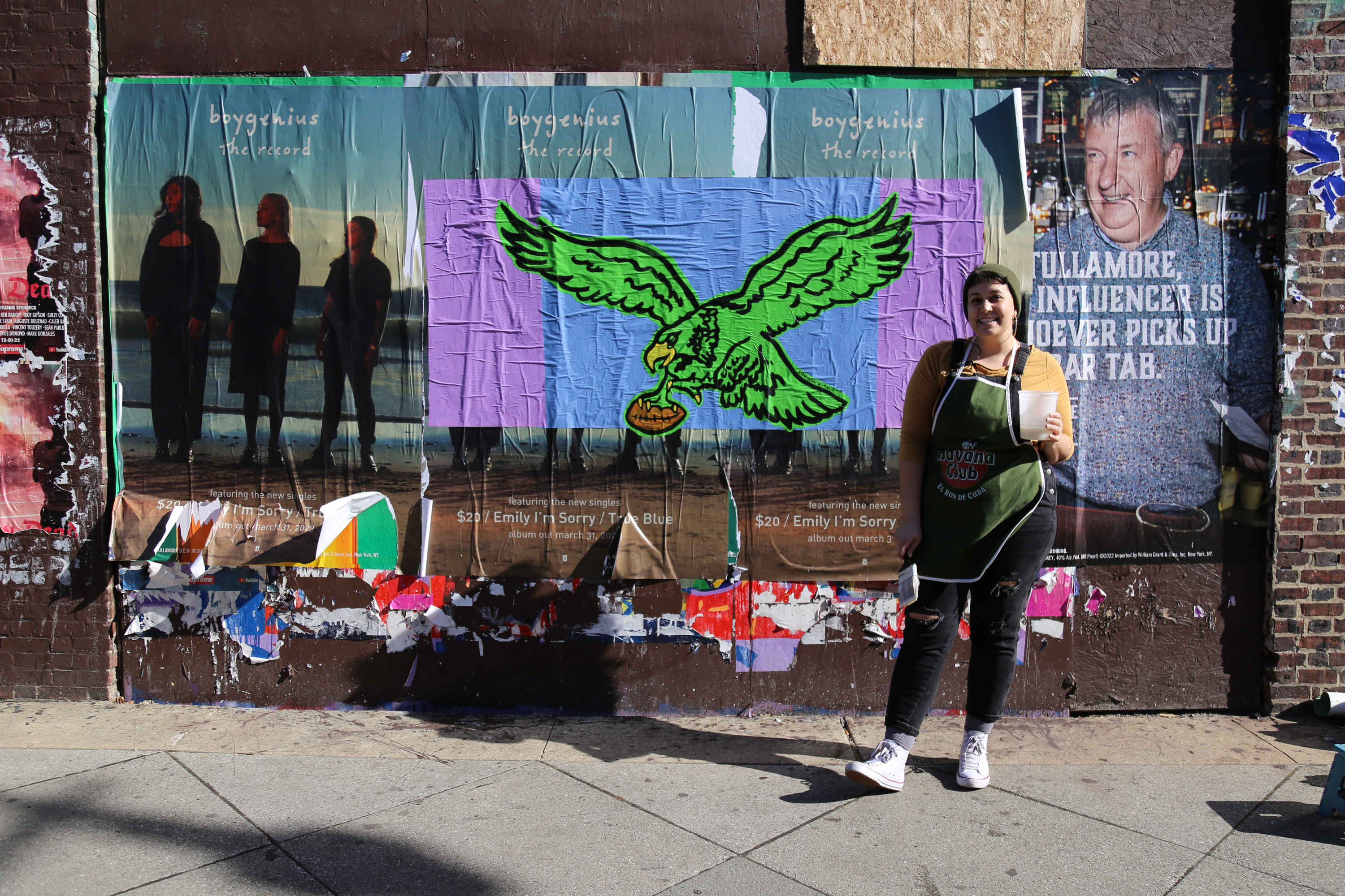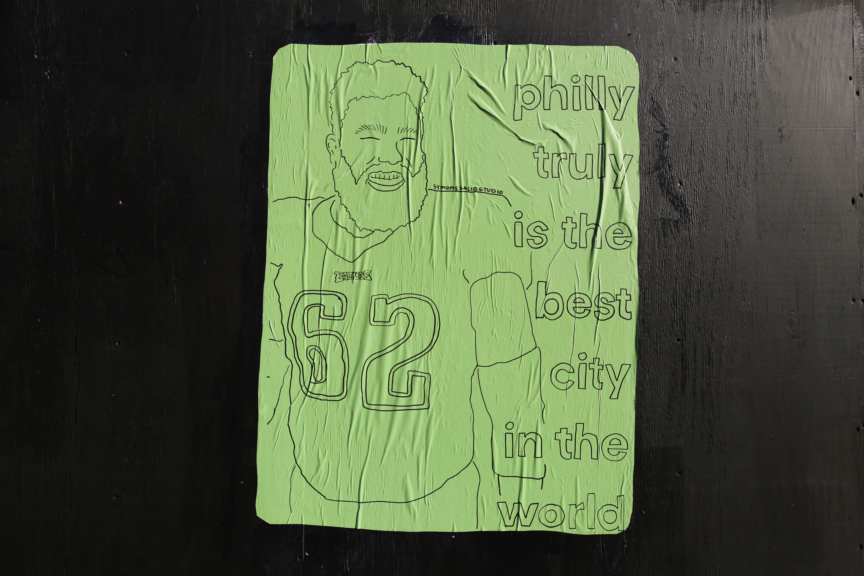 Two new wheatpaste installations today from Philly-based street artist, Symone Salib. And with just hours until the Super Bowl, you guessed it–both new artworks celebrate the Philadelphia Eagles!