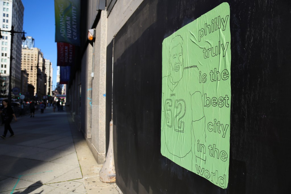 The first, which depicts the classic 1987 Eagles logo of a soaring eagle gripping a football, is located at Broad and Fitzwater Streets. The second, which depicts Eagles’ center, Jason Kelce and the correct phrase, “Philly, truly the best city in the world,” is located at Broad and Pine Streets.