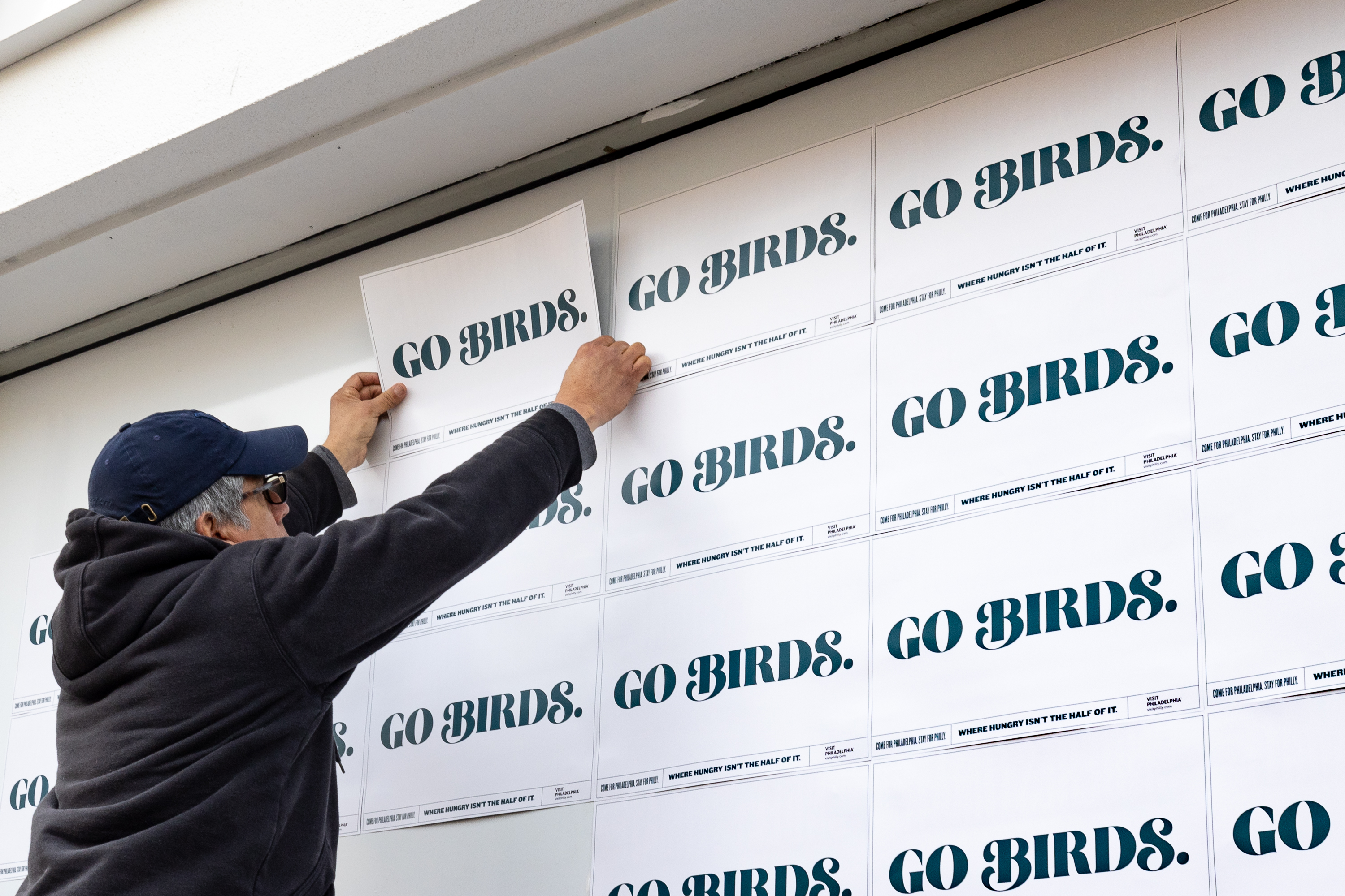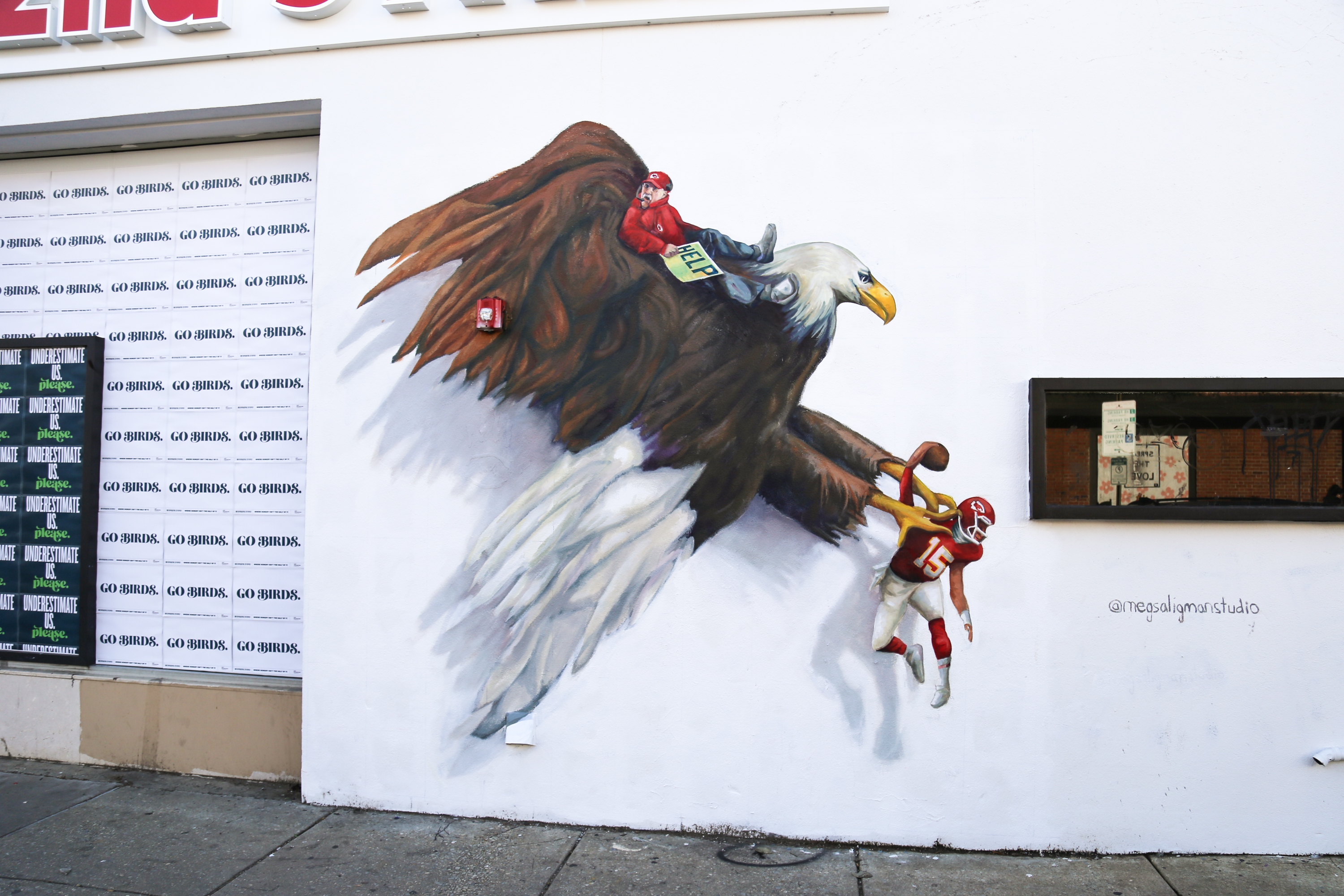 “My best projects start from a place of love, and I truly love the Eagles,” Meg said in a press release sent to us earlier this week. “I created a mural before the Super Bowl in 2018, so I’m wearing my good luck pajamas and creating a new mural to do our part to clinch this win. Philadelphia is the mural capital of the world, so we should definitely show the world our dedication on a large wall. It’s a Philly thing!”