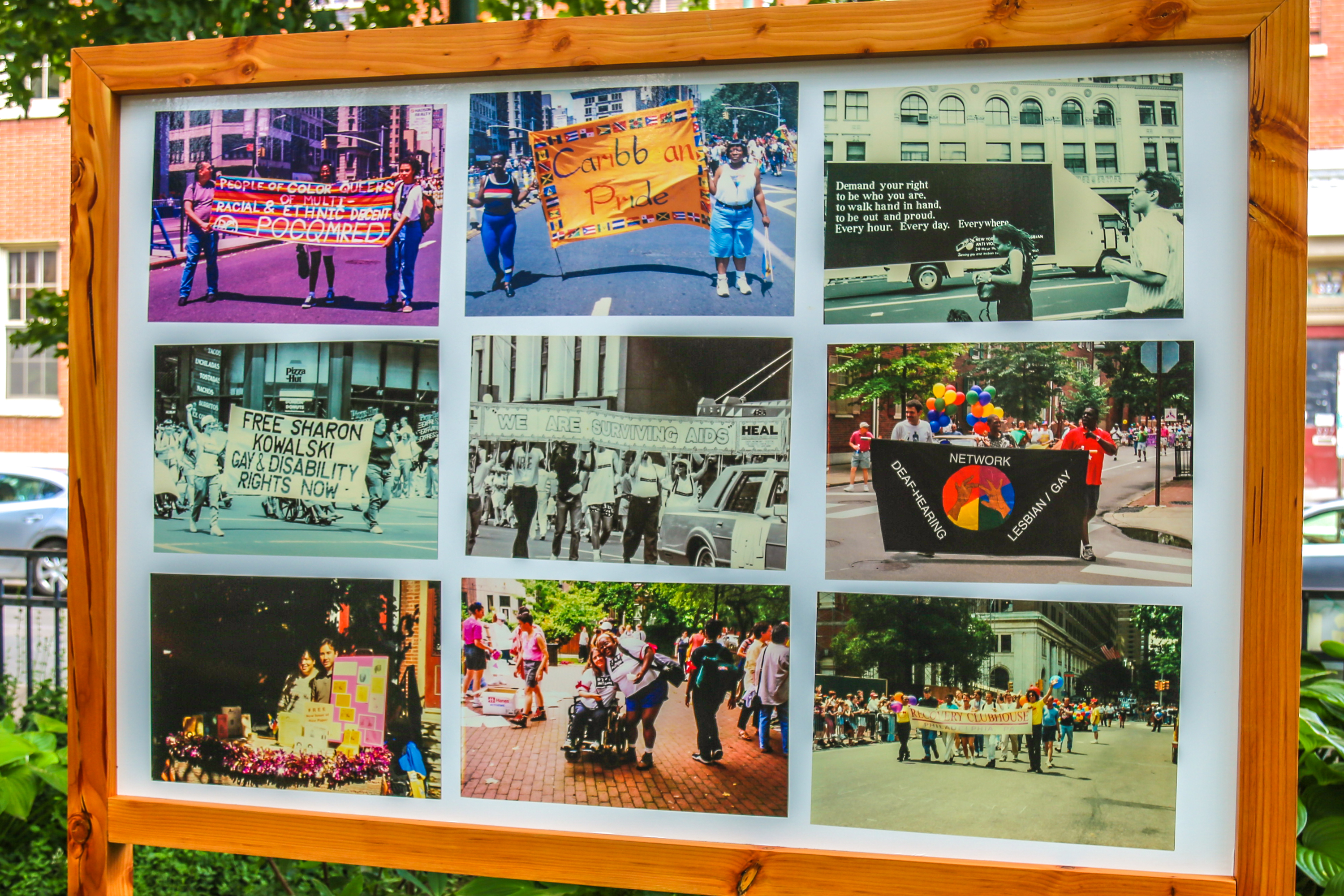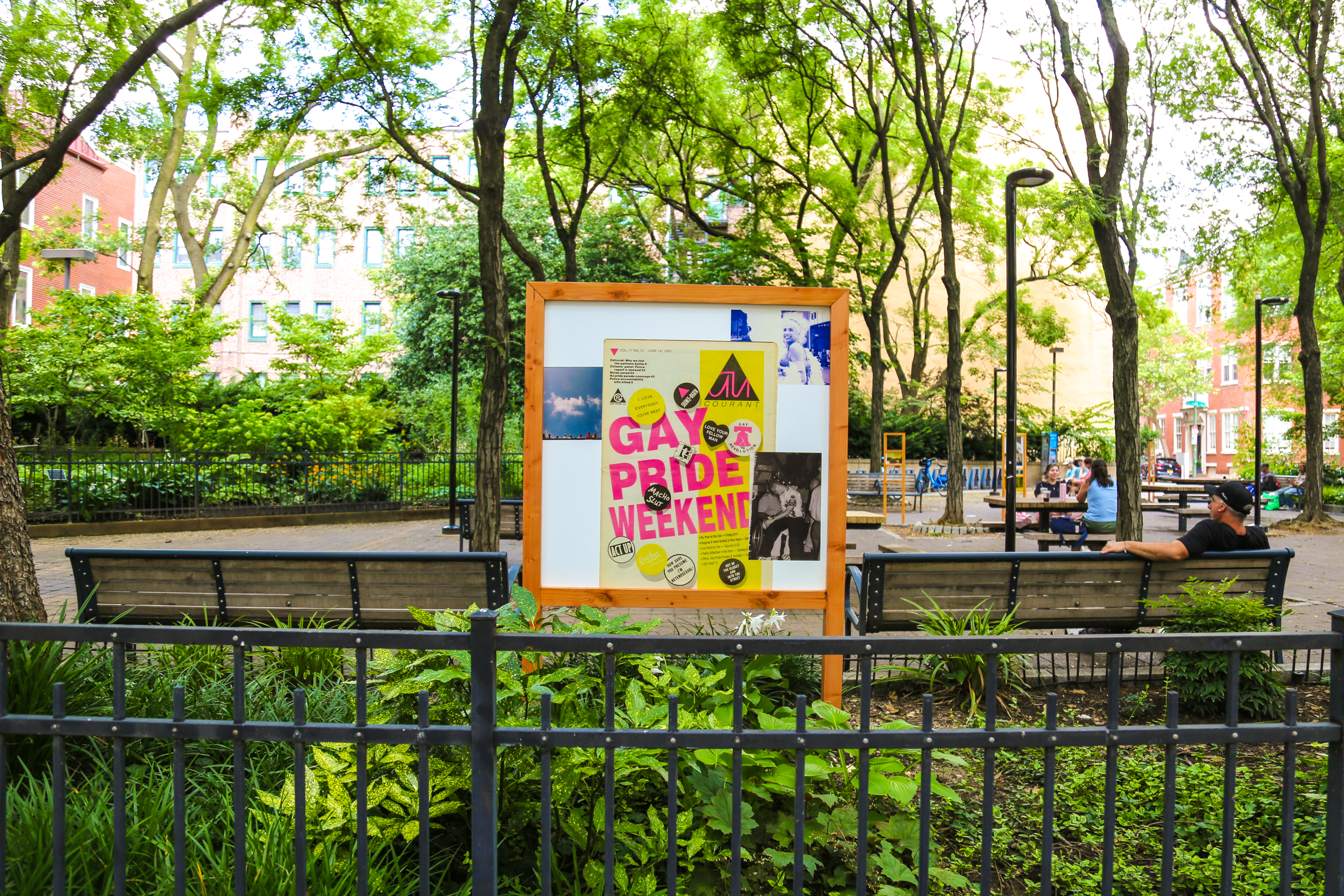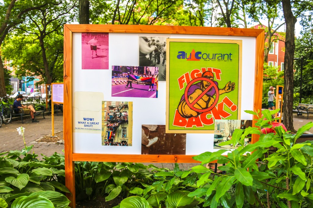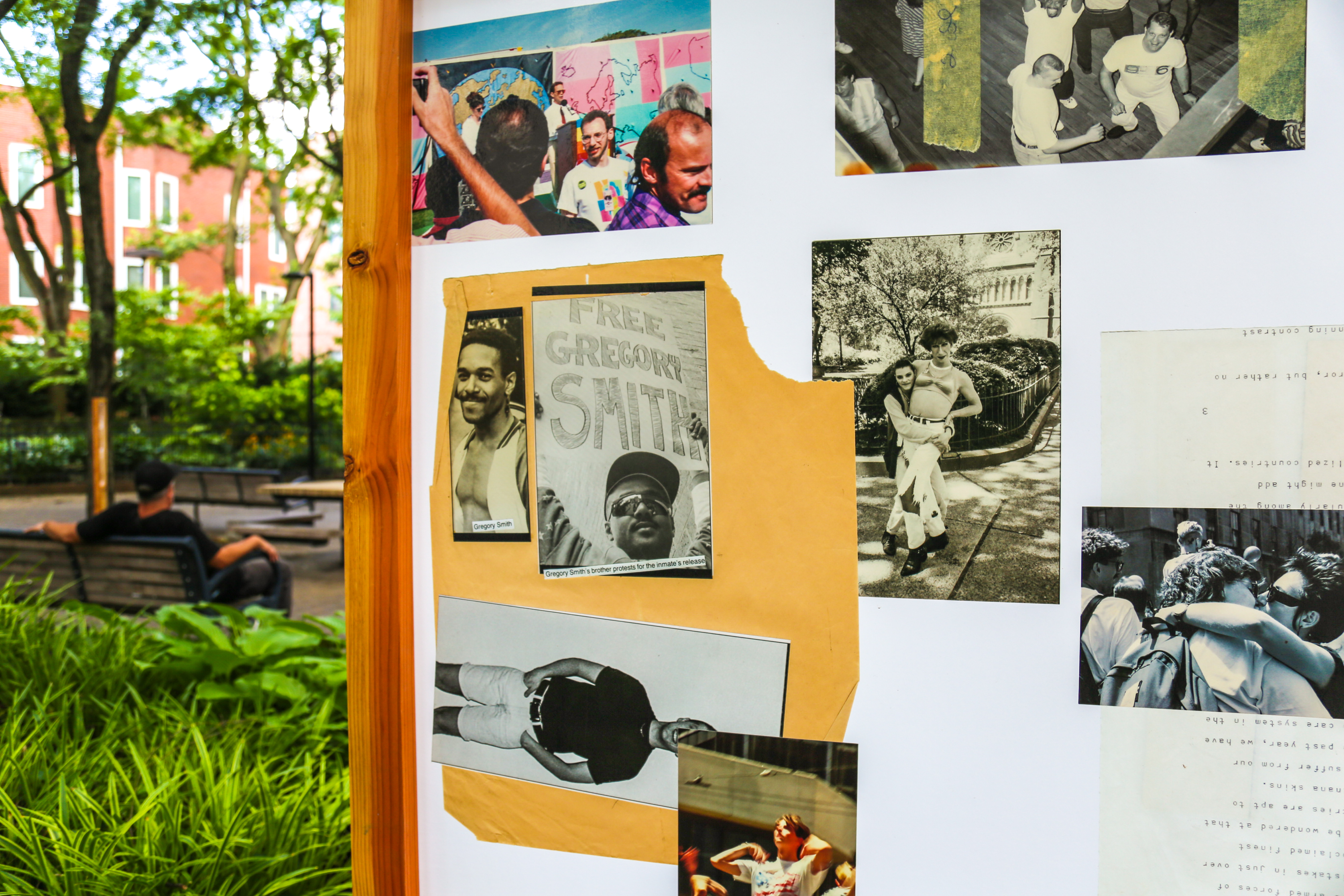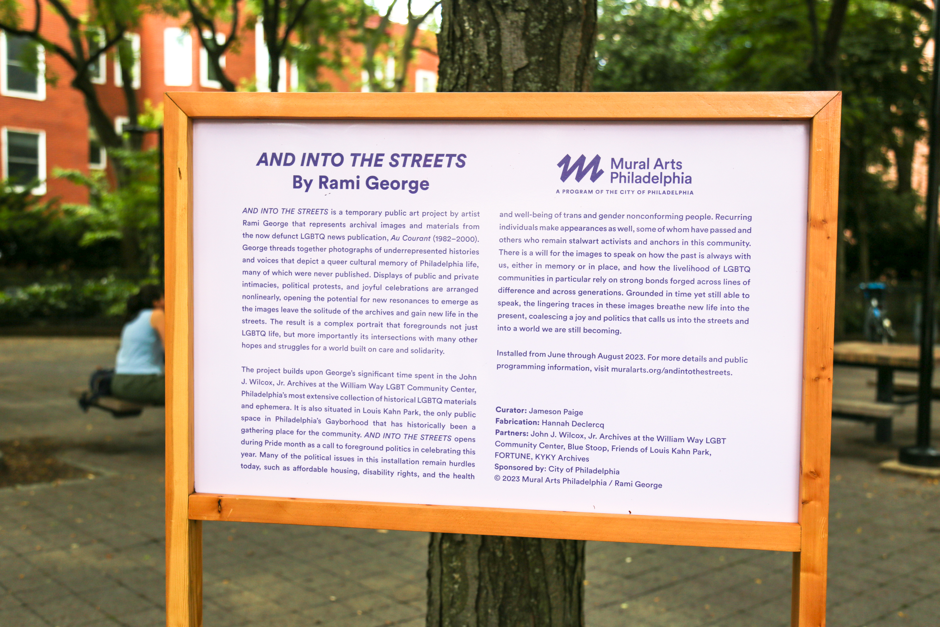 AND INTO THE STREETS is a public art project by artist Rami George and curator Jameson Paige, with support from Mural Arts Philadelphia and archival images from the William Way LGBT Community Center. Installed throughout Louis I. Kahn Park (located at 11th and Pine Streets in Philly’s Gayborhood), the project represents archival images and materials from the now defunct LGBTQ news publication, Au Courant (1982–2000).