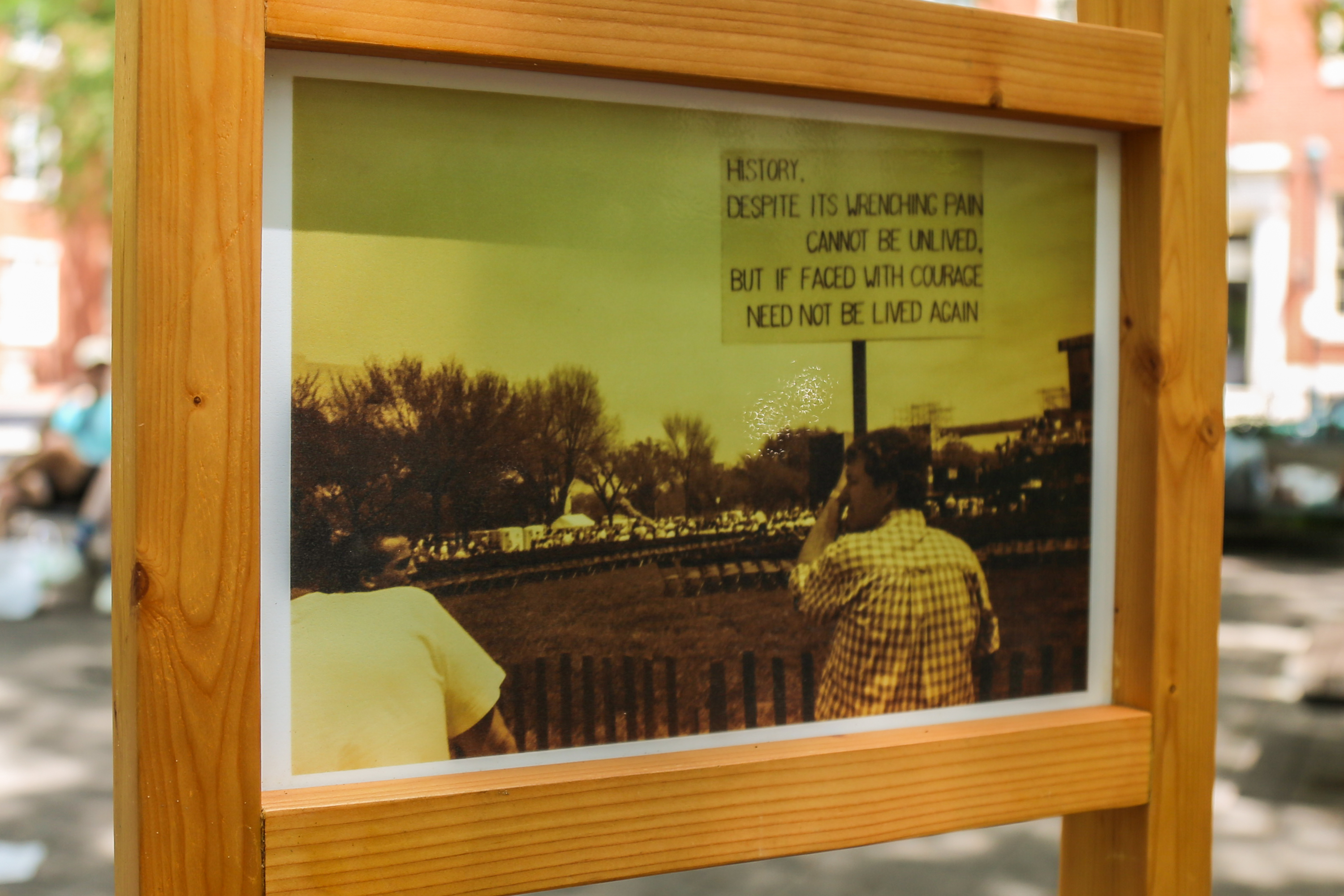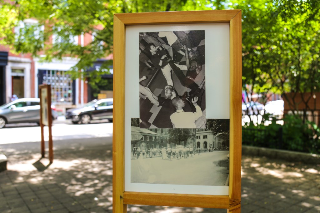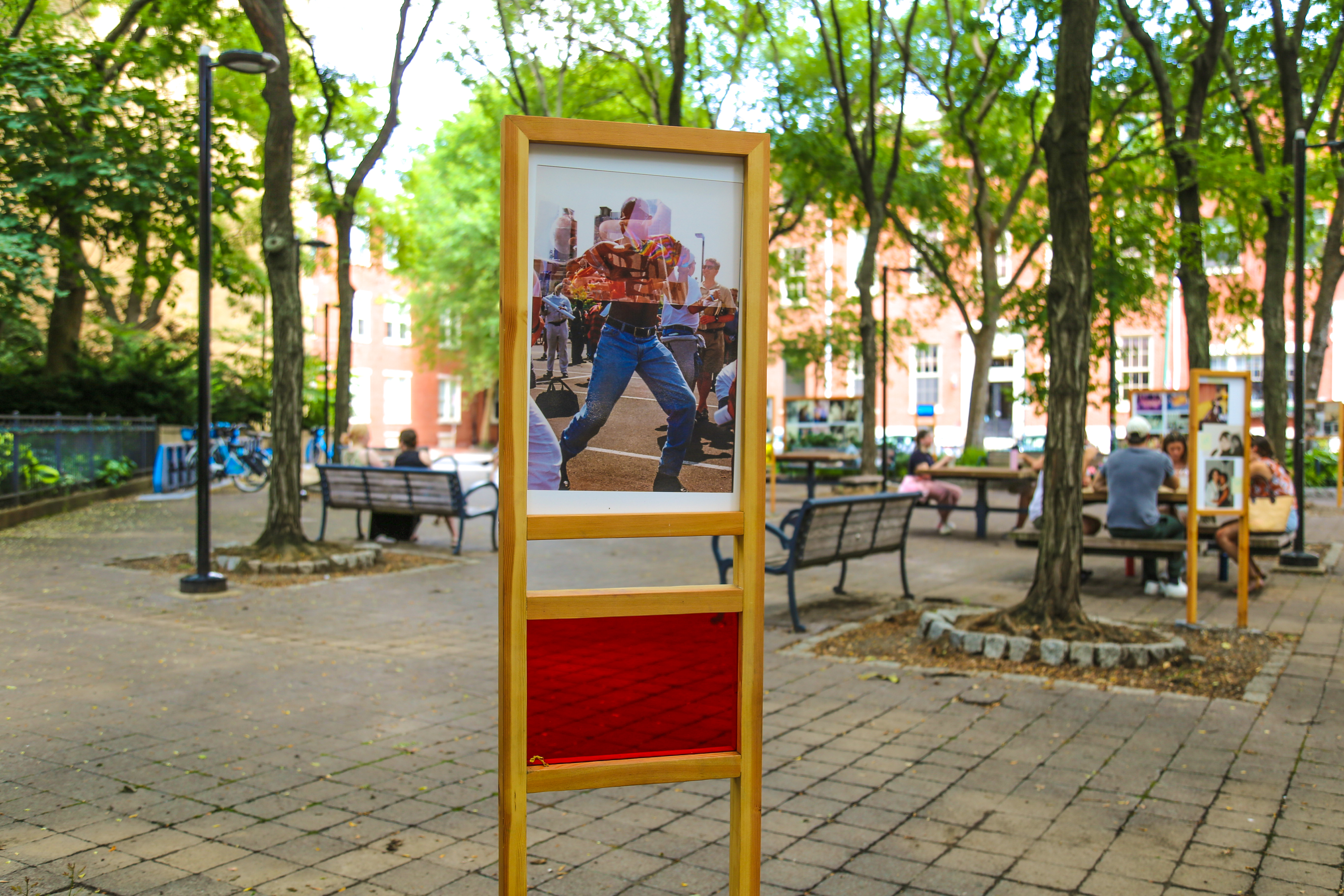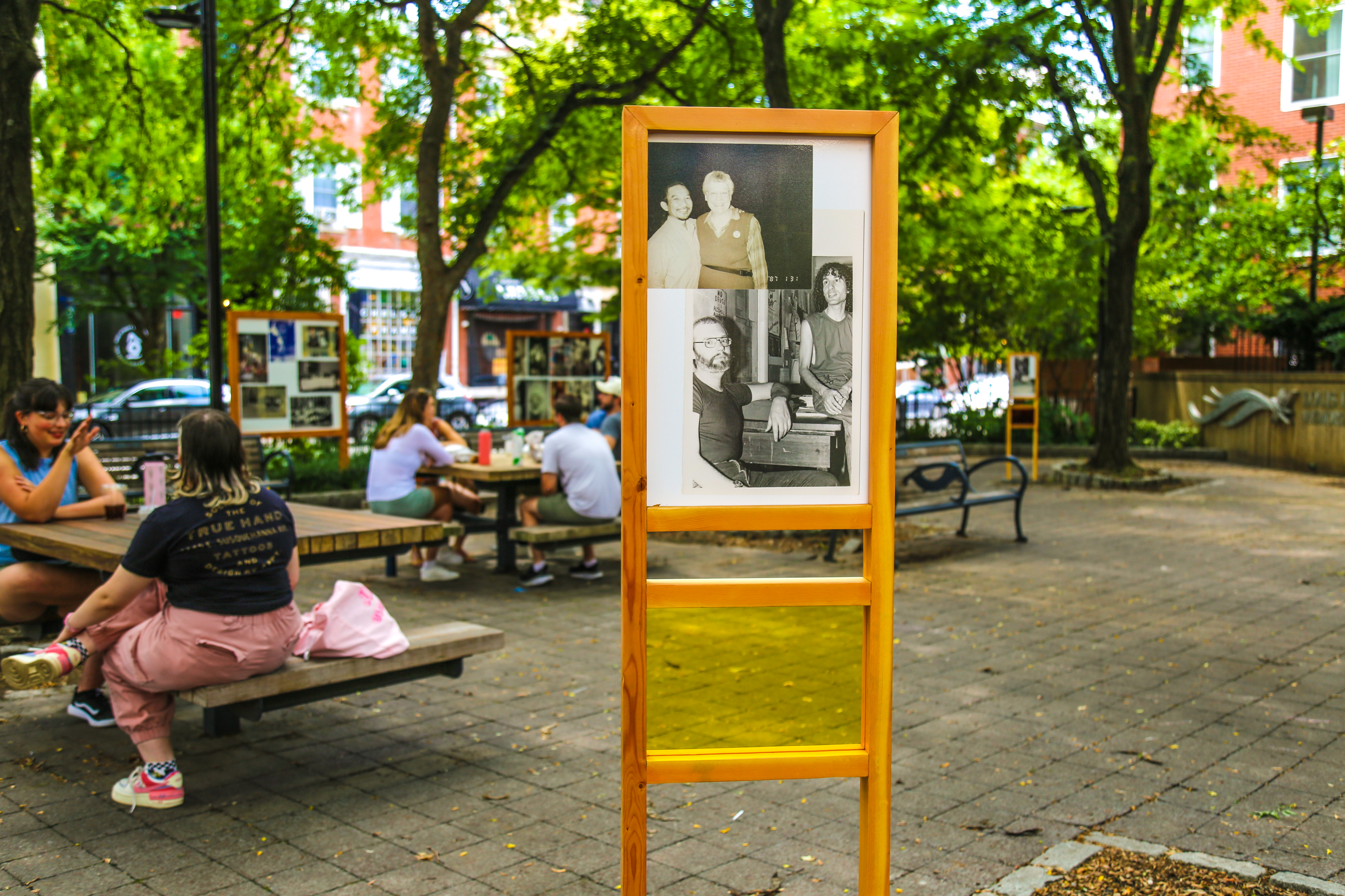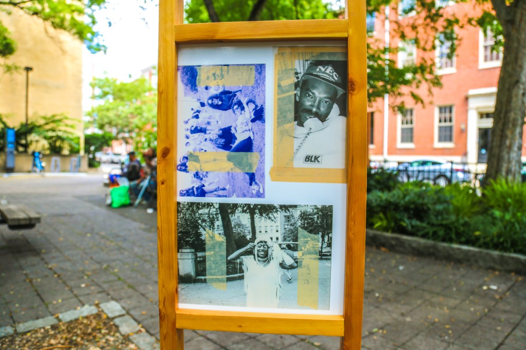 AND INTO THE STREETS is a public art project by artist Rami George and curator Jameson Paige, with support from Mural Arts Philadelphia and archival images from the William Way LGBT Community Center. Installed throughout Louis I. Kahn Park (located at 11th and Pine Streets in Philly’s Gayborhood), the project represents archival images and materials from the now defunct LGBTQ news publication, Au Courant (1982–2000).