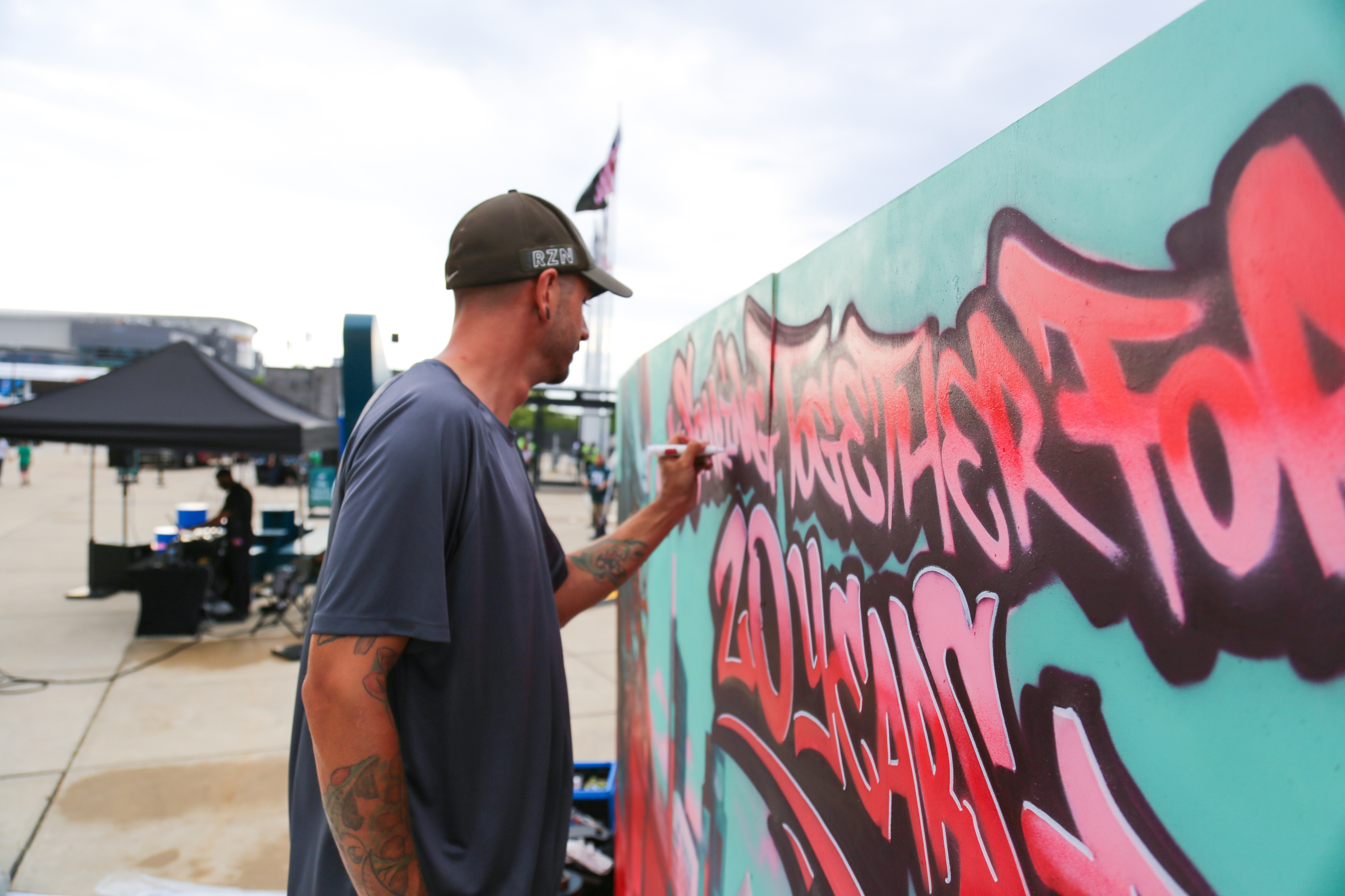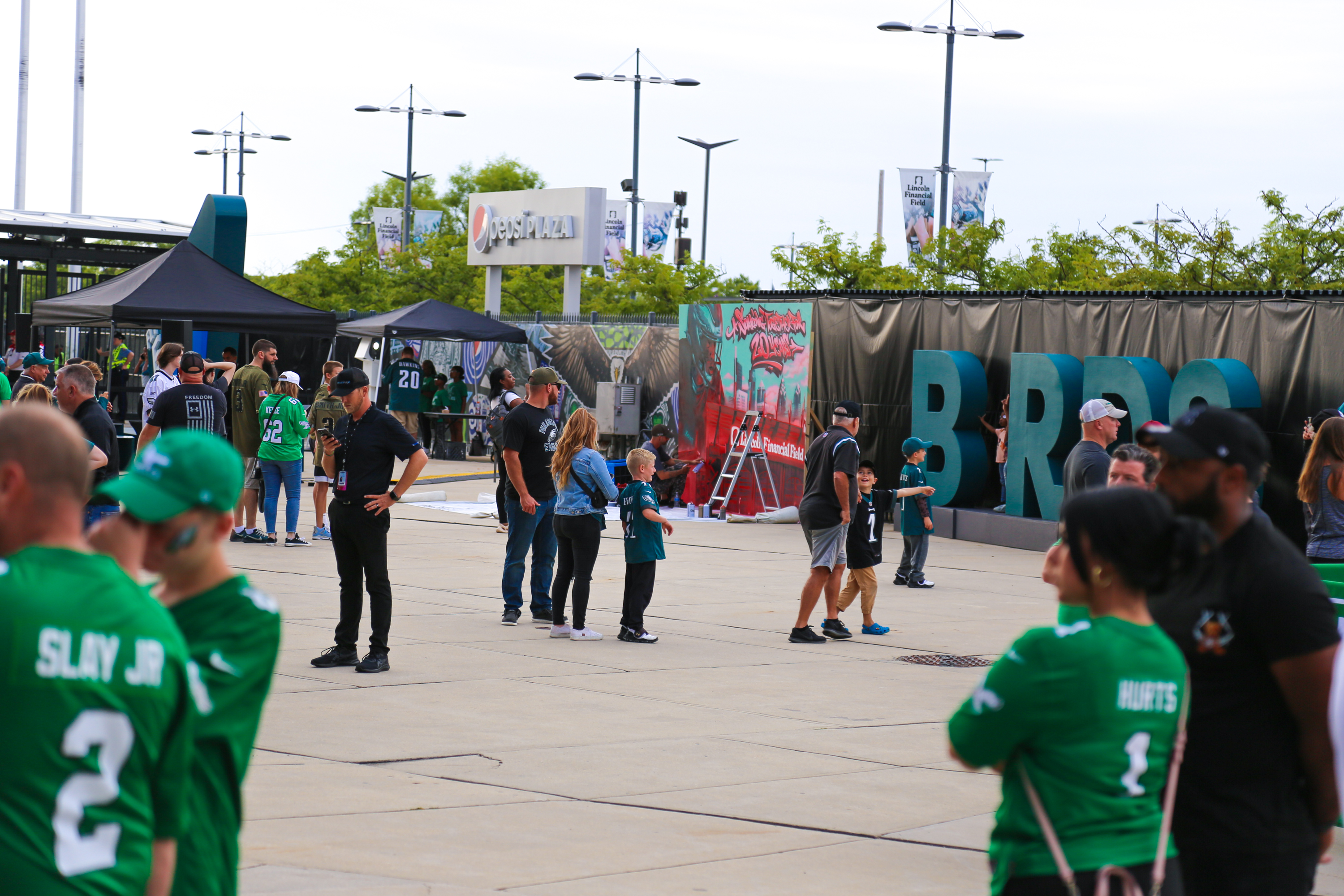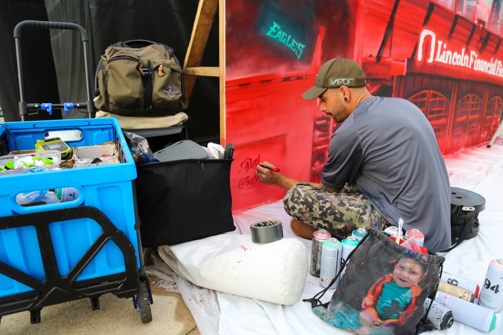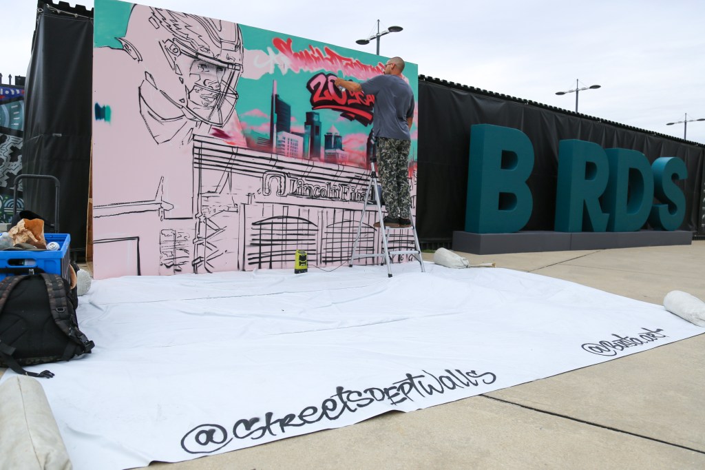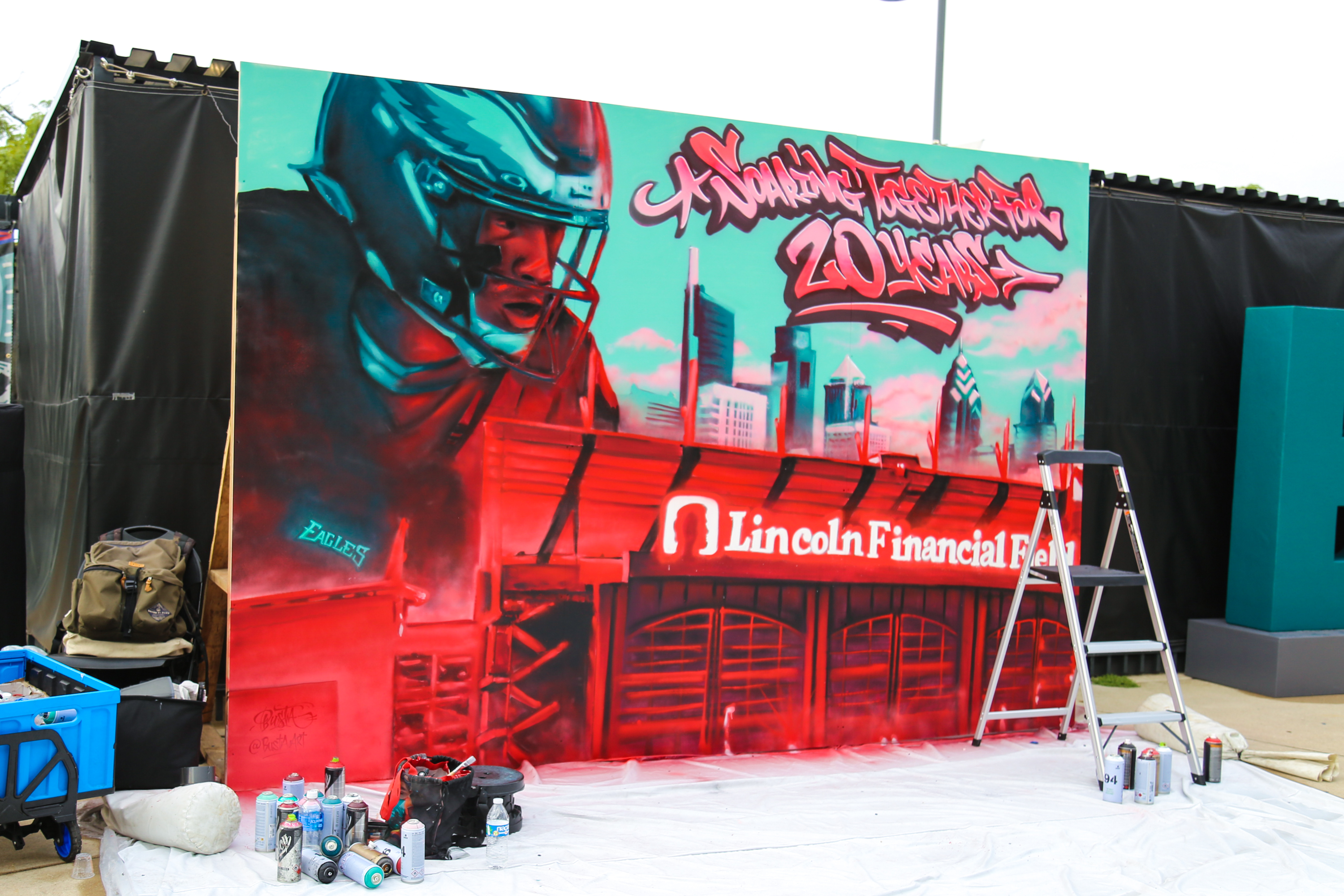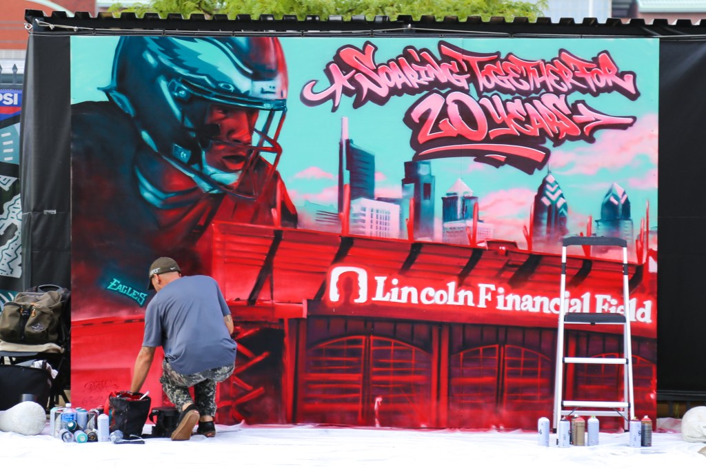 The mural was finished at a pre-season Philadelphia Eagles game at The Linc where fans could see the artwork being completed, meet with the artist, and take selfies with the mural!