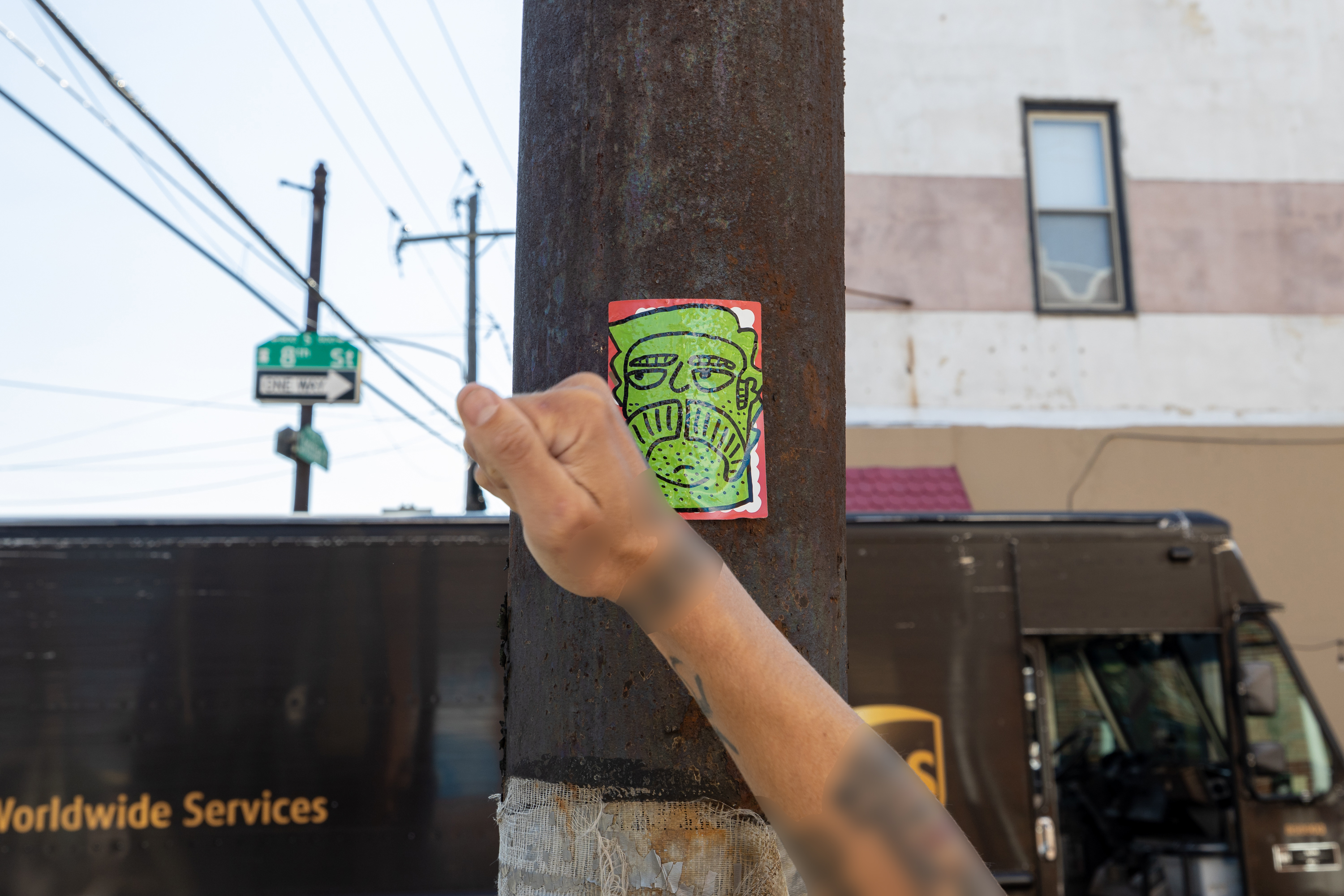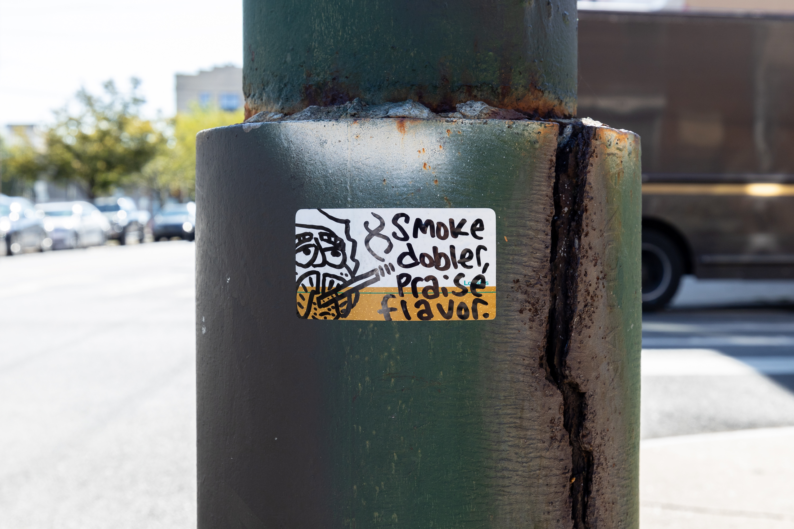 PD: I made some stickers arbitrarily back in, I think, 2018. And I just started putting them up. And a friend that documents graffiti—I didn’t know him [at the time], but he started seeing my stickers around. I used to have a Facebook page, the Transcendent True Faith Church of Dobler. And he messaged me through that and said do you want to meet for coffee? And he’s like so how long have you been a street artist? When he used the word “street artist,” I was like me? What? Oh, no, I’m not.