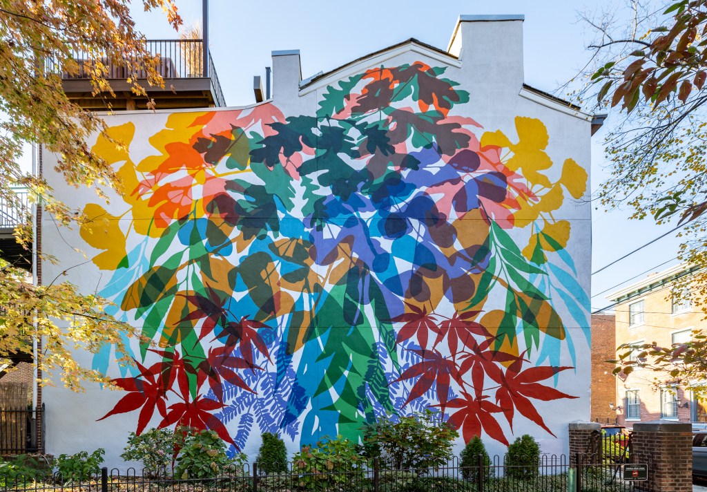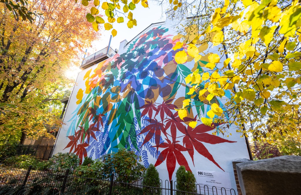 “[This mural was] inspired by many outings to parks and gardens around Philadelphia,” the project’s website reads. “Kien’s observations of shadows on leaves as the sun shines through them became the main visual element of this mural. By choosing to use leaf silhouettes of native trees along with those from around the world the artist wanted to reflect not only the diversity of plant life in our area but the diversity of cultures in the neighborhood and Philadelphia as a whole. The leaf varieties and where they are from include: Burr Oak, eastern North America; Sassafras, eastern North America and eastern Asia; Ginkgo Biloba, native to China; Japanese Maple, east Asia; Willow Tree, northern hemisphere including North America, Europe, Asia; Logwood Tree, native to southern Mexico; Jacaranda Tree, native to South America; and Mopane Tree, southern Africa.”