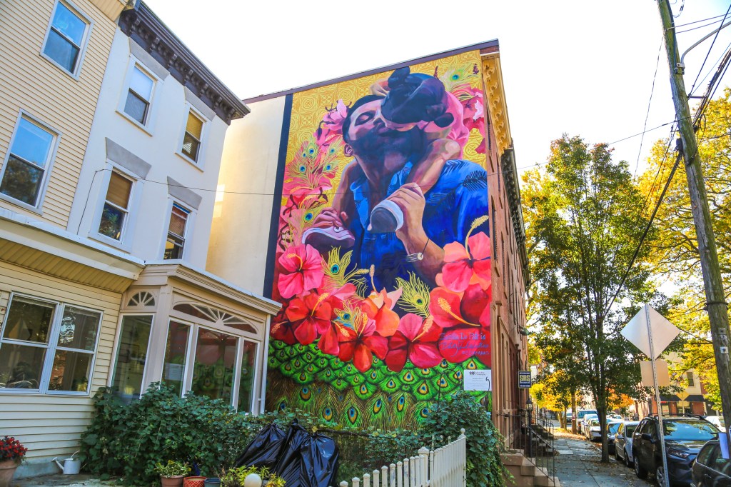 “The mural is meant to change the narrative on the role that fathers play in Black and brown communities,” a statement from Betsy reads on the Public Art Archive. “Semilla de Patria is a vital piece of art in a neighborhood that is quickly being gentrified. Our stories need to be plastered on the walls of our communities. We are not going anywhere. Many community members, high school students, and interns participated in the production of this painting. The image is of a father with his young daughter surrounded by hibiscus flowers, which is the national flower of Puerto Rico. The peacock feathers, seen throughout the mural, are symbols of charity, faith, rebirth, and hope.”