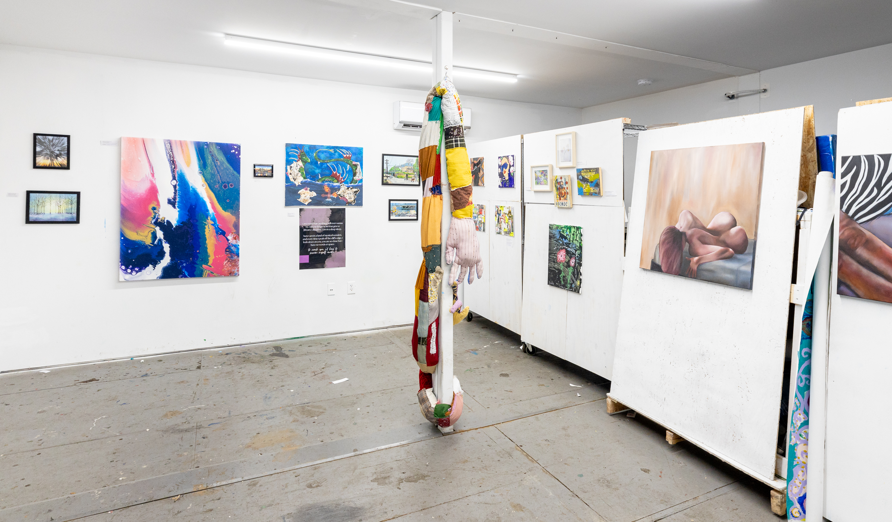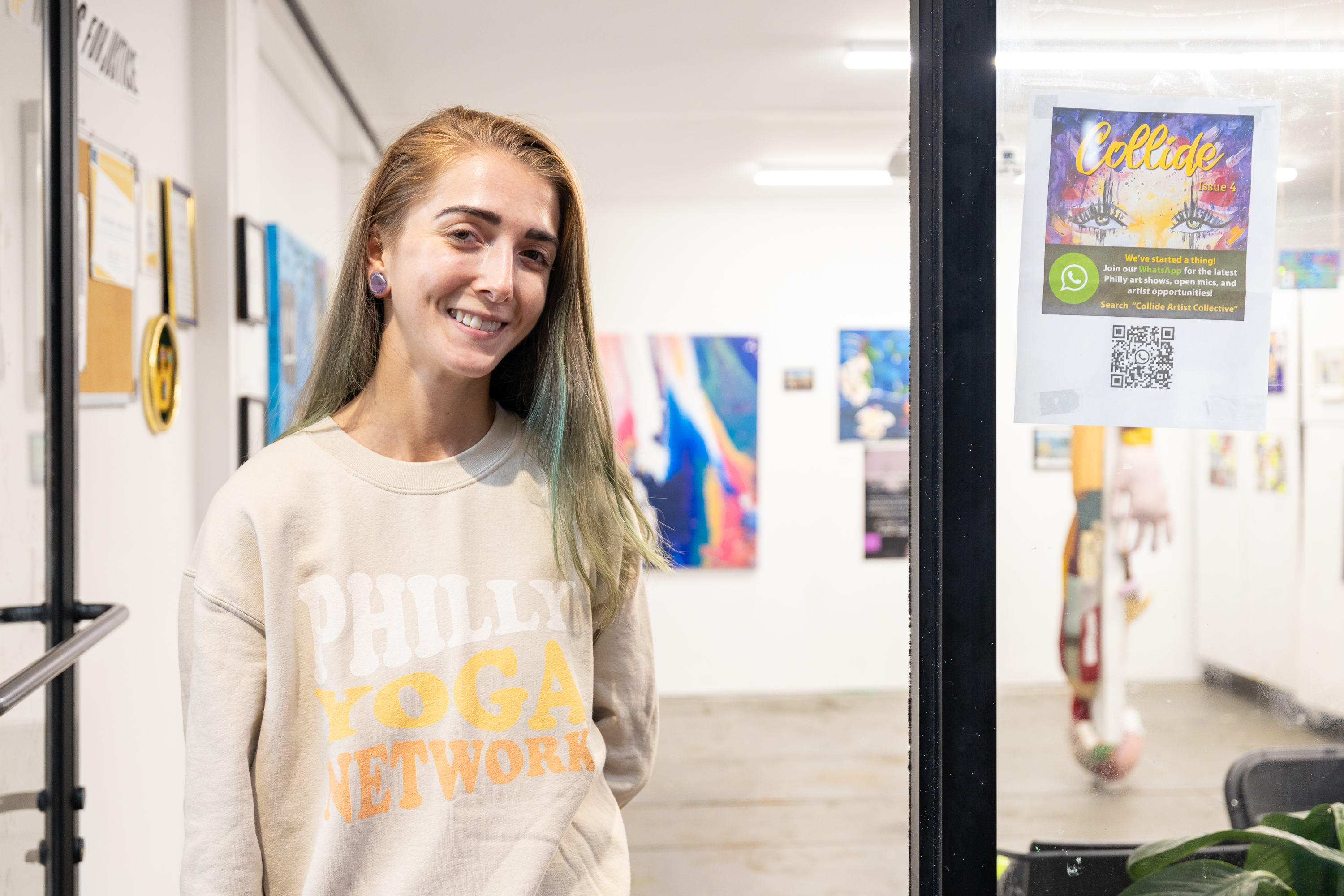 To learn more about Collide, I recently sat down with the group at the Walls for Justice studio space at Cherry Street Pier. The group art show on display at the time was a perfect backdrop—all around us were the works of local artists, most of whom had previously been featured in Collide.