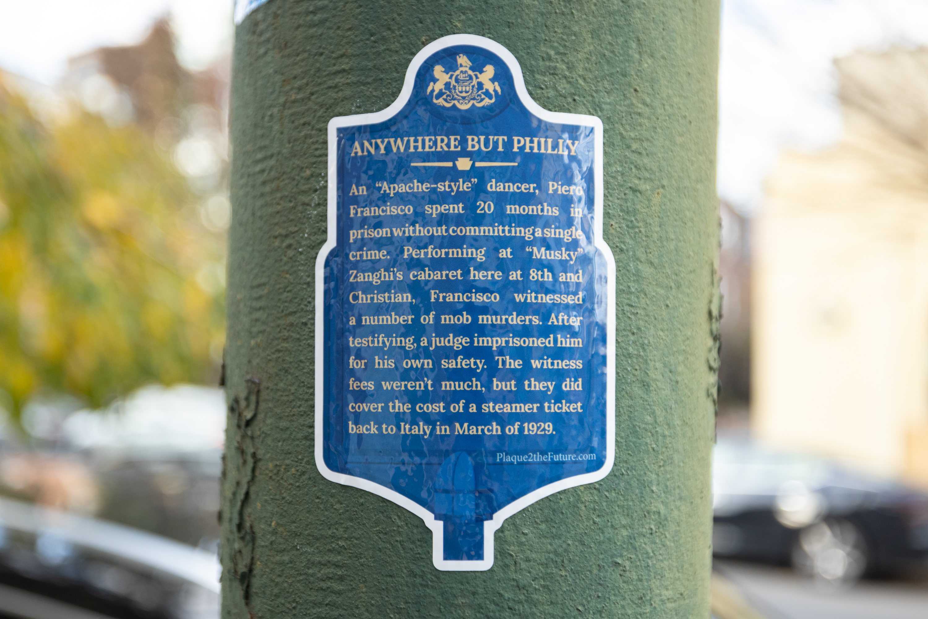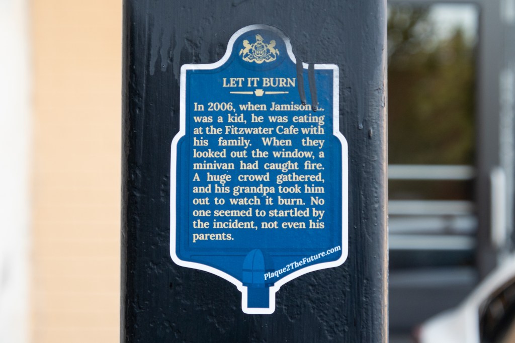 PF: My response to that is this is very much a parody, and a “people’s power” version of the plaques. I very much don’t believe that anyone could think that one of these plaques is [authentic]. At some point, I read about—maybe it was in the [Inquirer] article—about how expensive [real historical markers] are to install. So, it’s a state-run project, it takes multiple edits, it’s metal. I intentionally print [mine] as vinyl since they’re pretty easy to take off if you put them in a good spot. And I actually think it’s important that it doesn’t stay as a permanent fixture the same way that a permanent sign would.