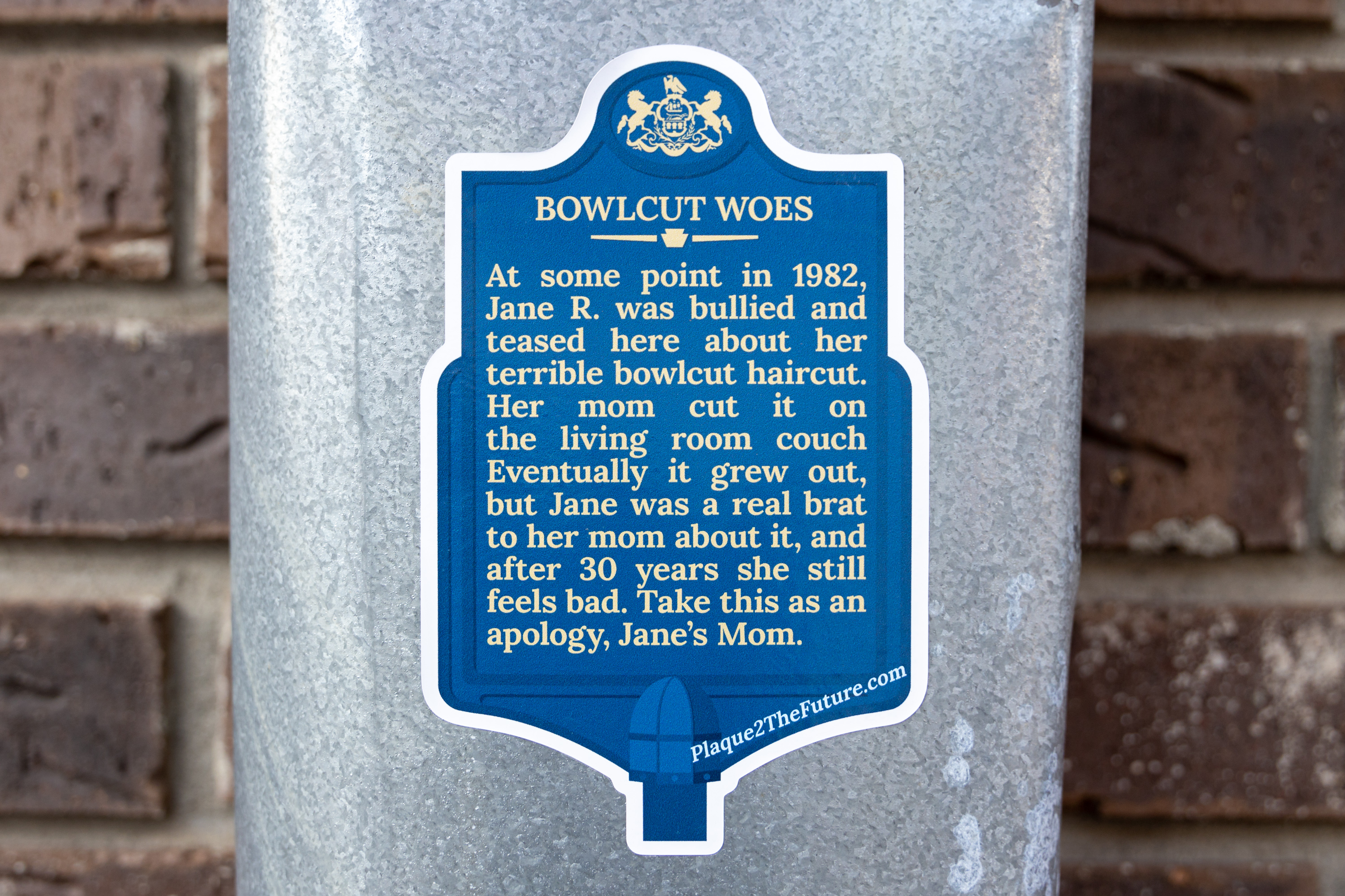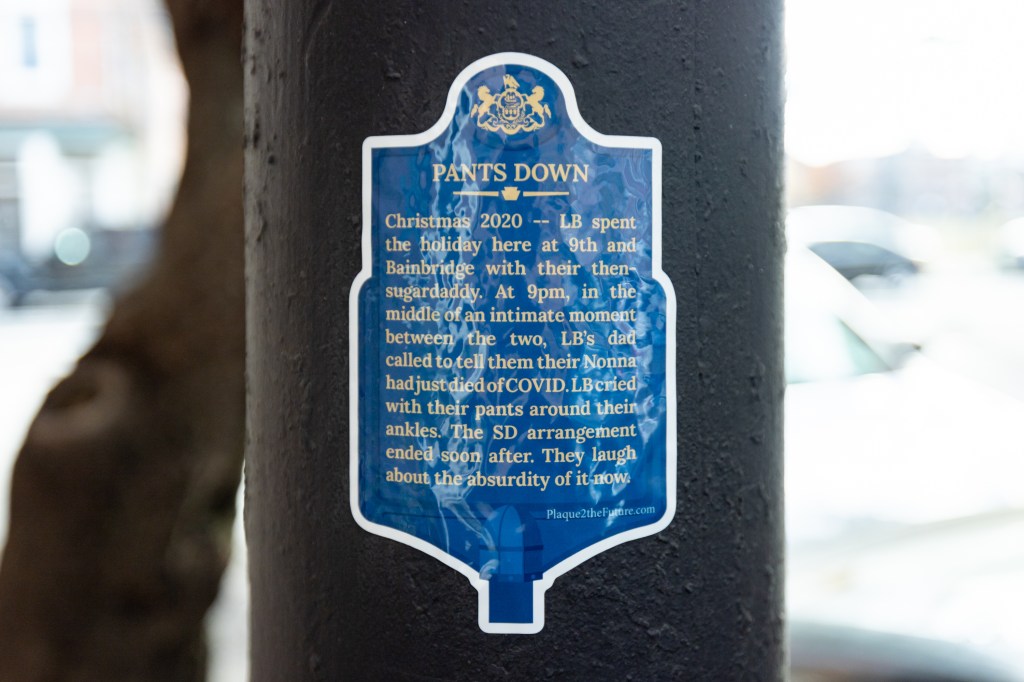 Plaque to the Future is an ongoing project that brings unique personal anecdotes to the streets of Philadelphia in the form of custom stickers (which the creator tells me are now locally printed). The design of the stickers—right down to the sometimes unbelievably awkward spacing of the words—parodies the iconic blue plaques installed by the Pennsylvania Historical and Museum Commission throughout the state as historical markers.