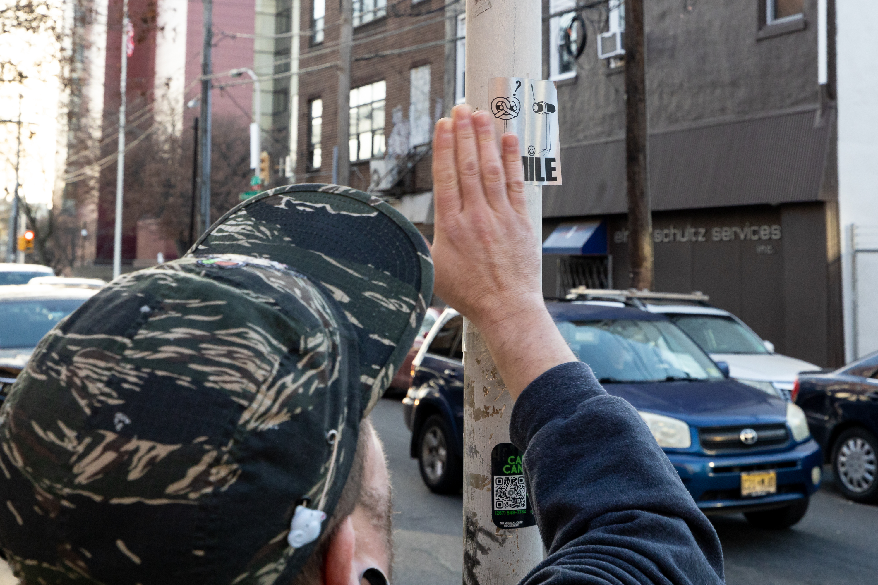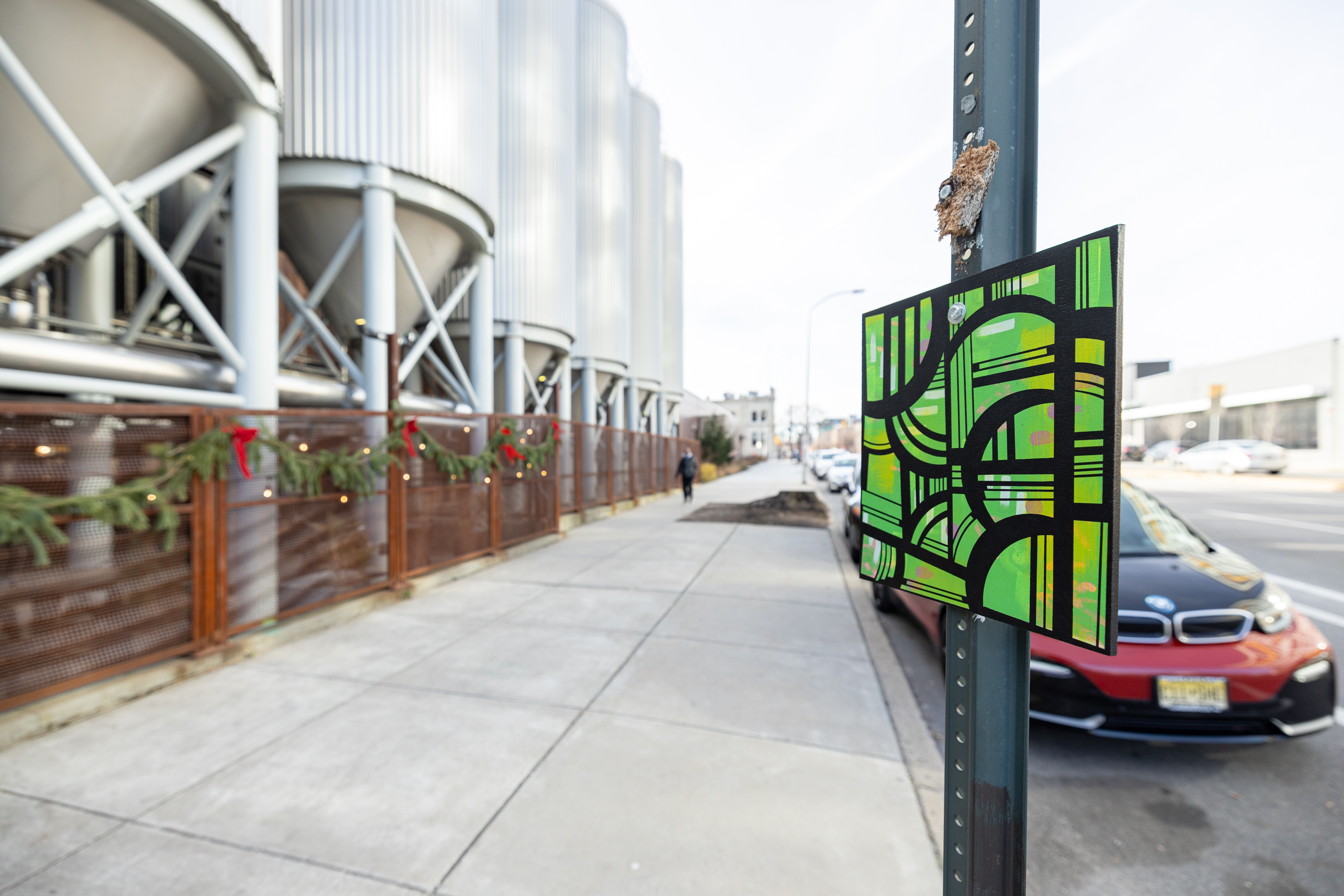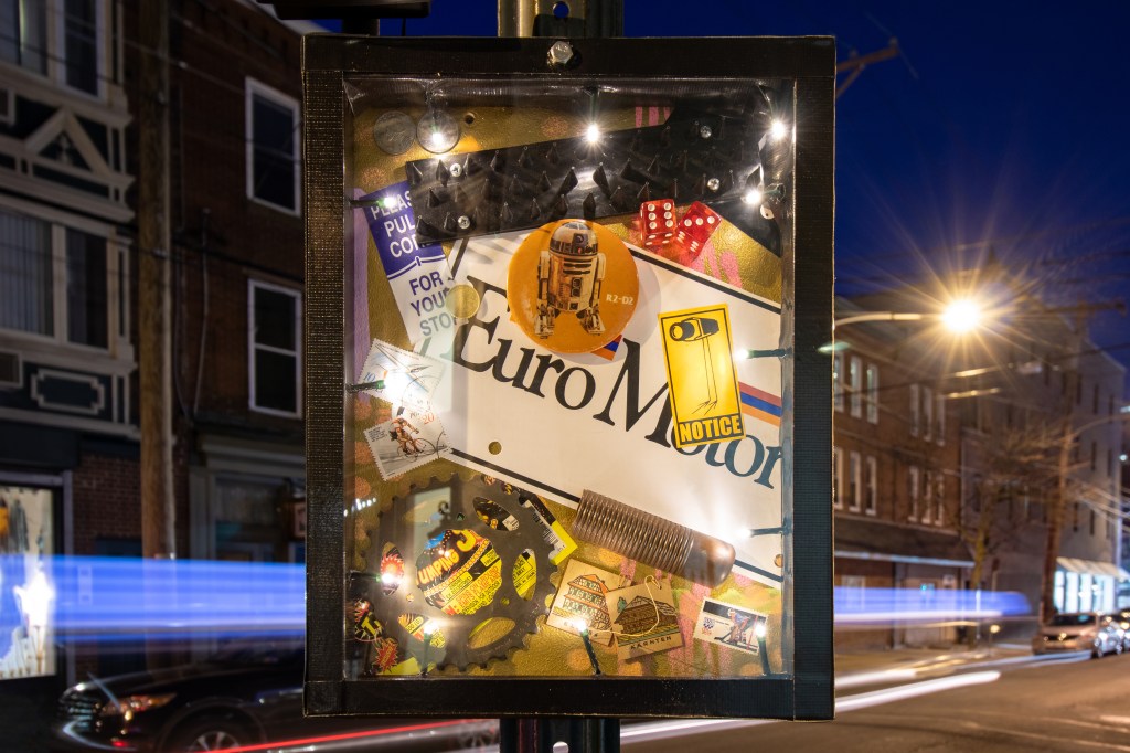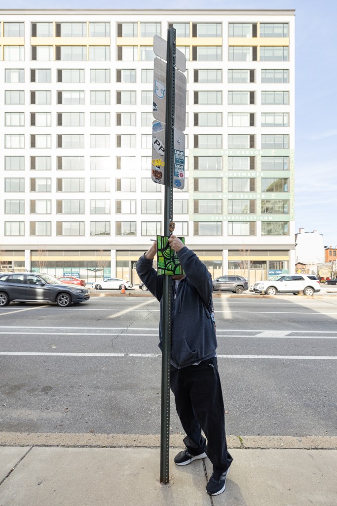 A fair number of sticker artists in Philly dabble in bolt-ups, but few artists make them a main focus of their work. The notable exception is D.T., a street artist who defies categorization—seemingly by design—and has been quietly creating innovative, beautiful, and just plain cool art since about 2008. It’s often on blocks of wood mounted to sign posts.