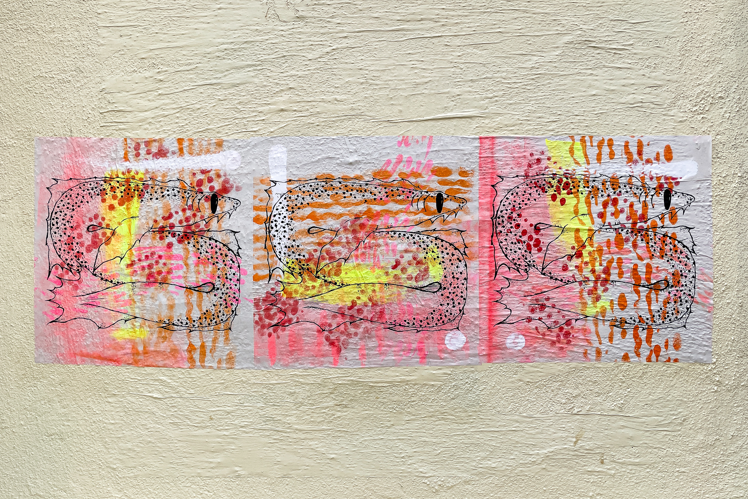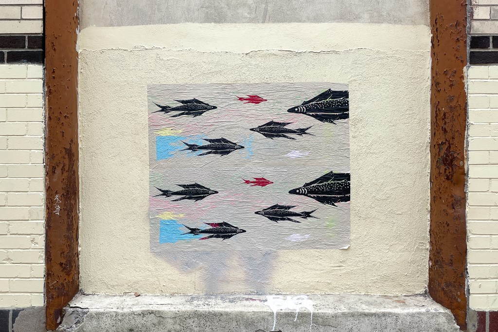 DT: Yeah, that’s what everyone says, so I guess it’s working because it’s original. Like, if you saw that, you would go oh I know who did that. Because nobody else does it like that, and I’ve worked, purposely, years to try to get that. For a while, I just had that one fish that I would do. It was easy to draw real quick, I could do it on stickers; I could just do it on anything I wanted. But it wasn’t good enough, so I just kept trying to make more and more fish. And then I seen that technique where people print, like, real fish. I forget what it’s called. I was just like I wonder if I could make something that looked like that. That’s where the silhouette, like, the ones that are solid black [came from]. It was kind of that concept. And then the last fish that I did were just straight drawings. They’re not colored in. But I did some different designs on their backs that I used to do; just circles and ovals on there. Try to make them look weird, but like fish at the same time.