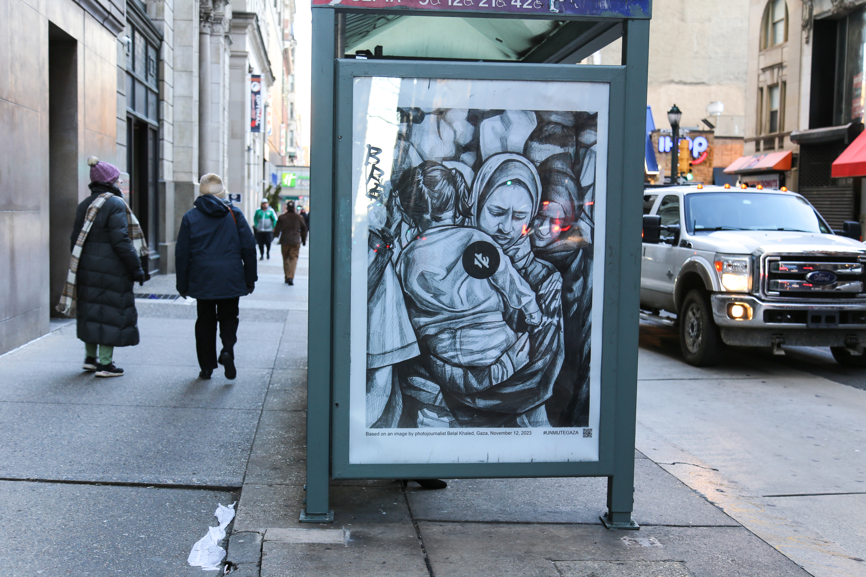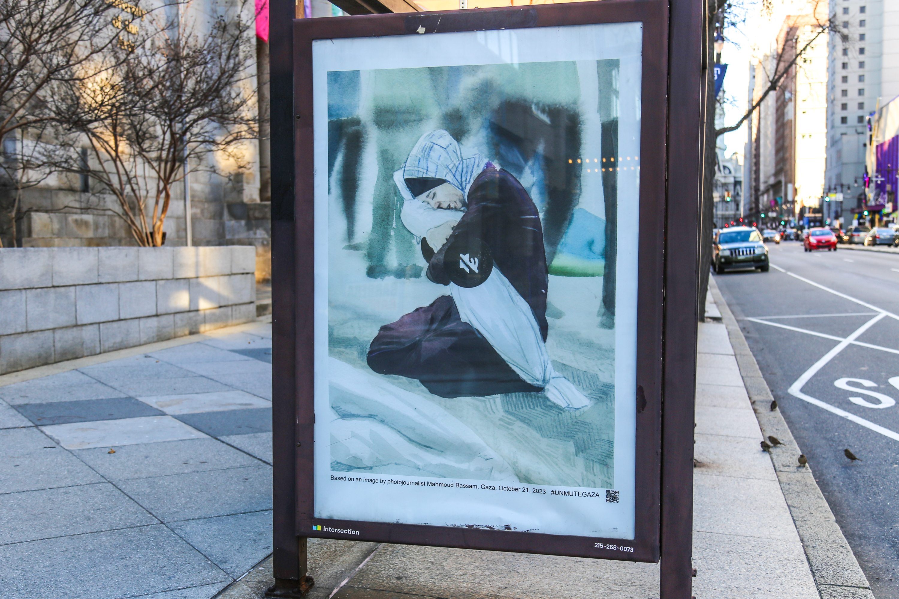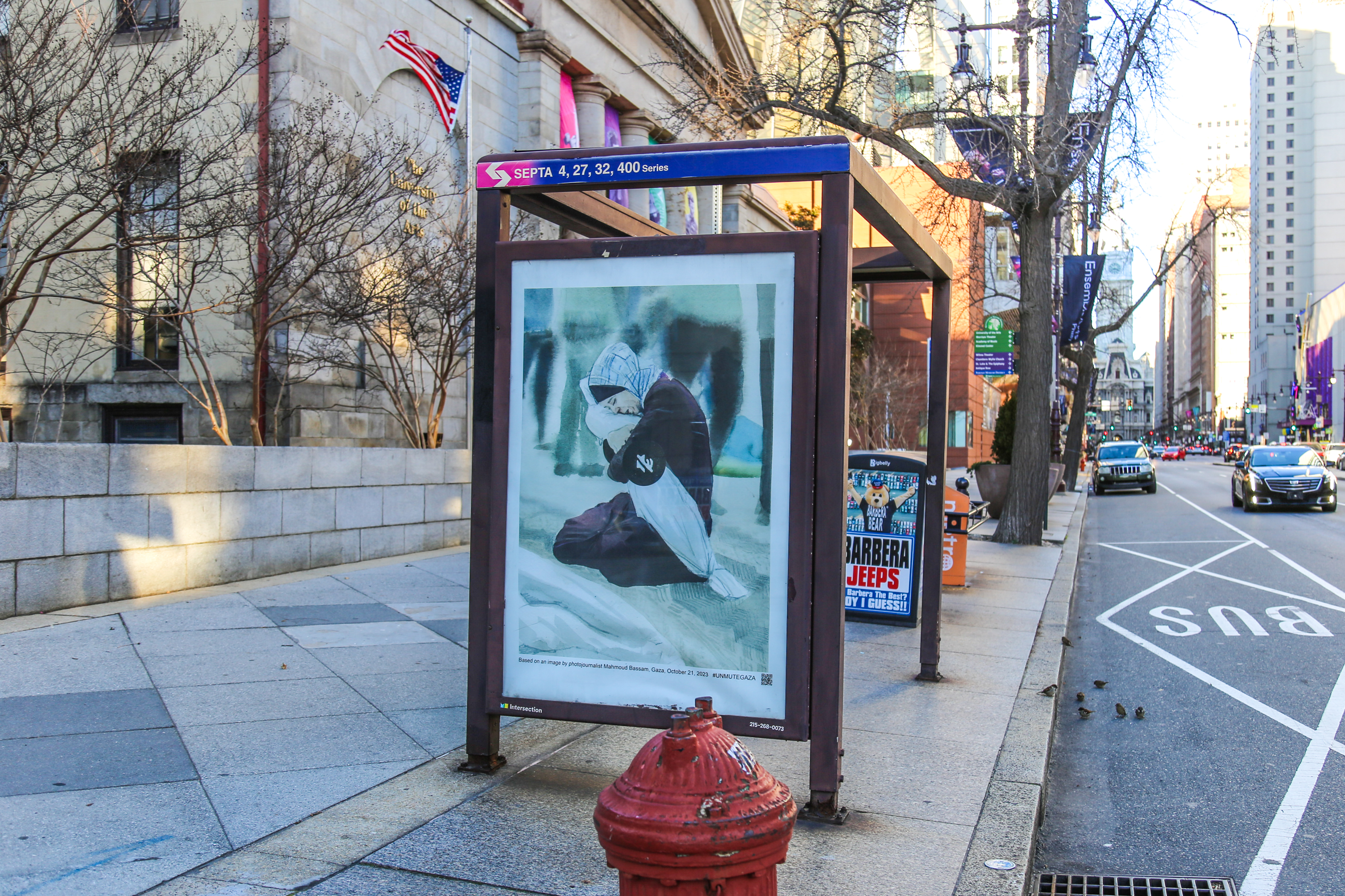 Over the last week a number of bus shelter ads around Center City, Philadelphia have been removed and replaced with images to remind people of the current crisis in Gaza and call for a ceasefire. This Philly initiative has been organized by Art in Ad Places, their first to-date in Philadelphia, using the artworks made available to the public by the Unmute Gaza project.