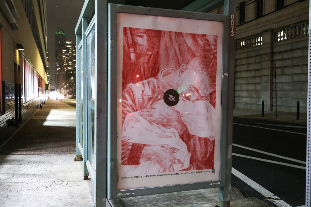 “Unmute Gaza has inspired us to pull out our high-vis vests for the first time in nearly three years,” Art in Ad Places explained. “With no payphones left in New York City, we headed to Philadelphia, which still has plenty of analog advertising infrastructure. Let’s not say that Art in Ad Places is back, but we are honored to be installing a selection of Unmute Gaza’s posters.”