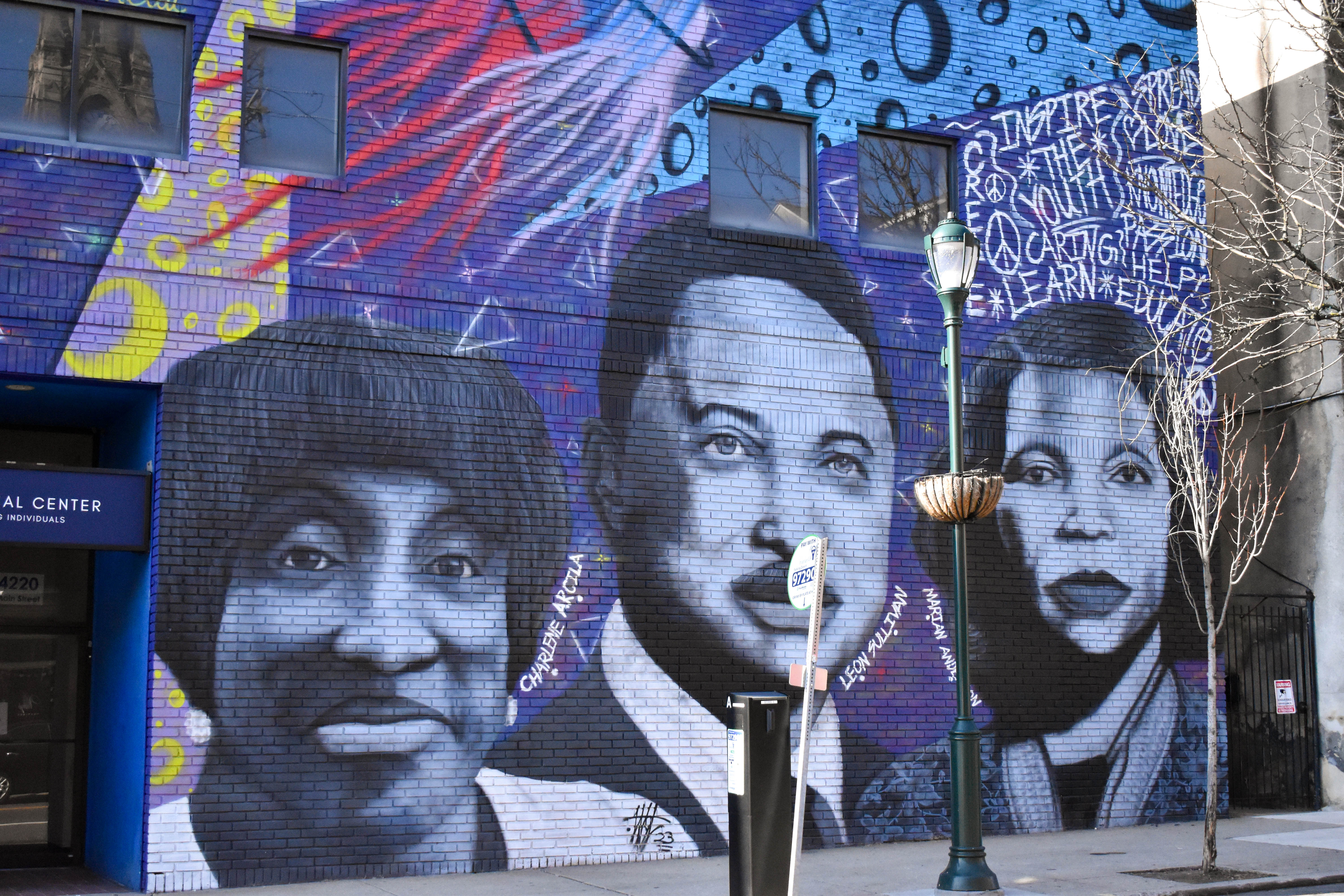 The mural includes the portraits of three iconic and historic Black Philadelphians. On the left is Charlene Arcila, a Mississippi-native who founded the Philadelphia Trans-Health Conference. This is now the largest conference providing healthcare to trans and gender-nonconforming people. Charlene also took part in the movement to ban gender markers on SEPTA passes.