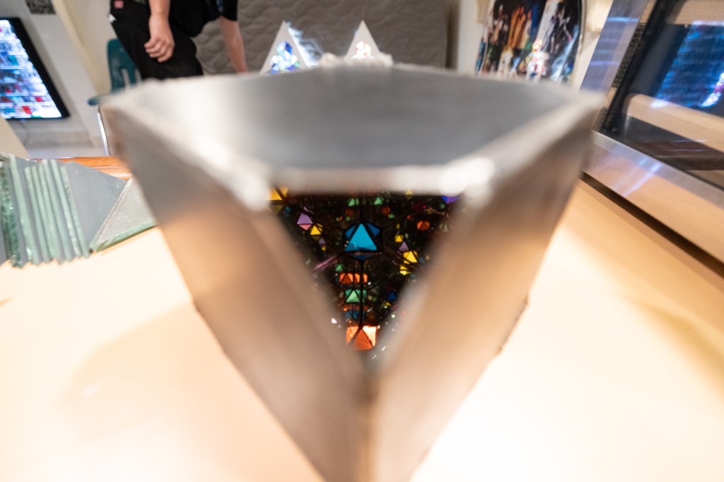 JT: So it’s this technique—I guess Louis Tiffany pioneered this. And this technique is, like, what hobbyists use. I’m not knocking it—it’s fine. It’s just not the traditional method. It’s become popular. A lot of people are using stained glass, and using copper foil and doing really cool stuff with it that you couldn’t do with lead. So there’s positives and negatives. It won’t last as long, and it’s not as strong, but when you’re coating the whole piece in a solder, it gives it the strength.
