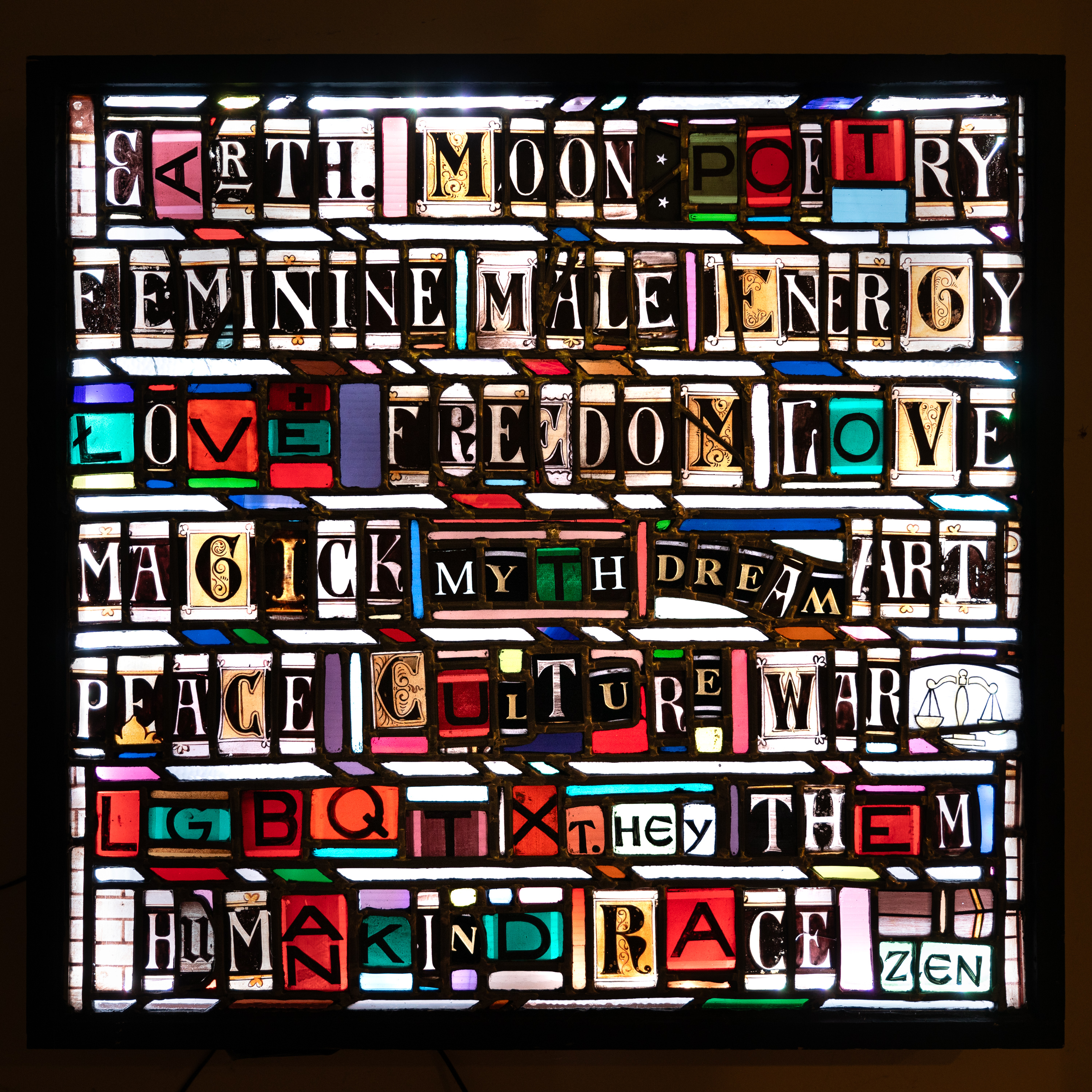 JT: Okay, so I’m coming at it as a stained glass artist and putting my own spin on it. Like, I’ve been trained as a traditional stained glass artisan. I’m putting my own spin on it because I’m using those traditional methods and technique to build it, but I’m putting it in public spaces to get that same feeling one would get in a church, but not in a church. It’s totally out of context. The subject matter is not the same as in a church, but the light shining through it and activating the glass—that’s where the power of stained glass is. So I’m using that light in my own way to express myself and to express my point of view as a stained glass artist.