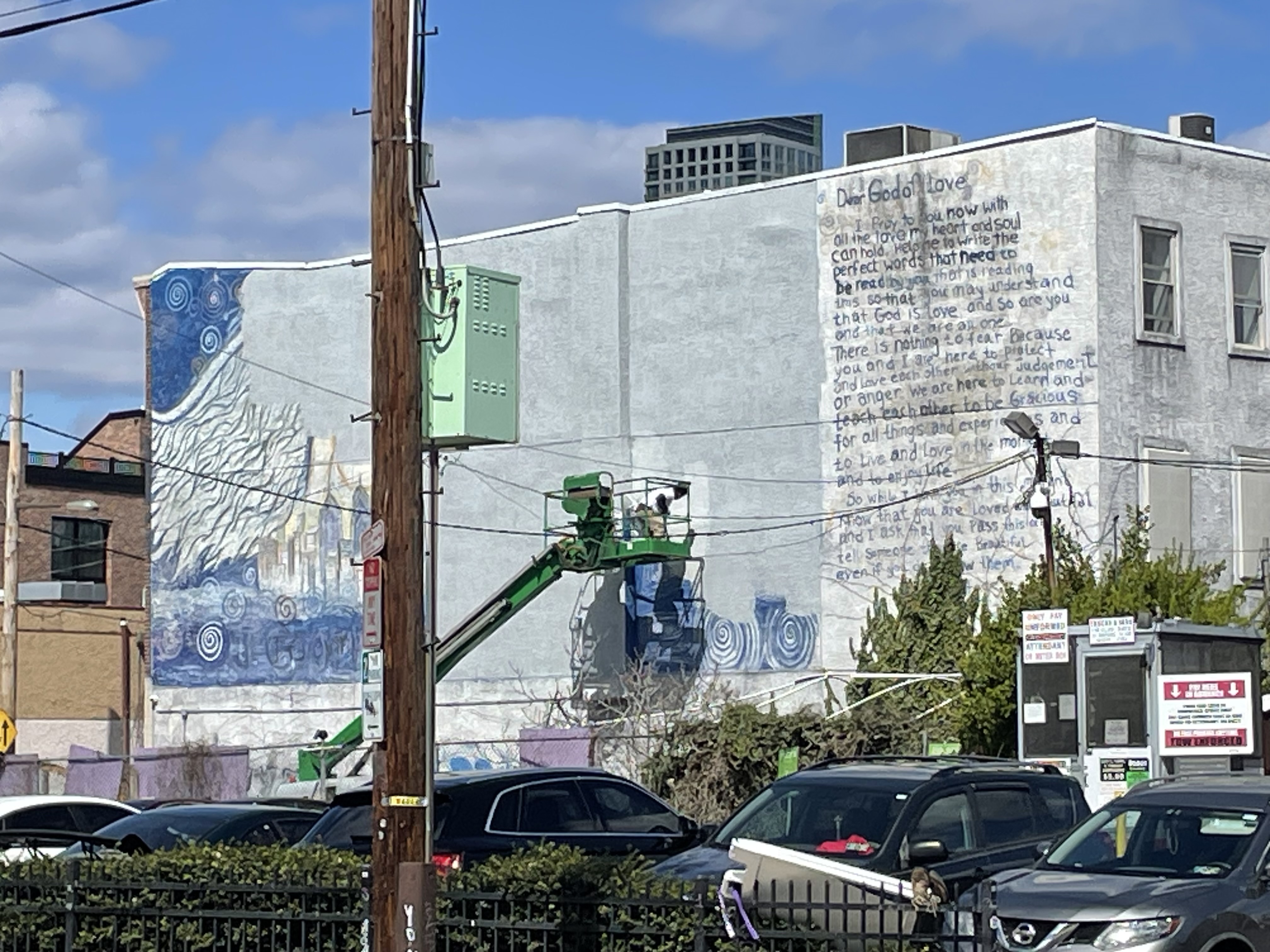 It appears South Street’s “Angel” mural is going away. Located at 5th and Bainbridge Streets, this mural has been a bit of a mystery from its beginning. Known mostly for its religious themes that are best summed up as “God is love,” the mural was painted in 2018 after a pair of adjacent rowhomes were demolished to make way for a six-story apartment building with a Target on the first floor.
