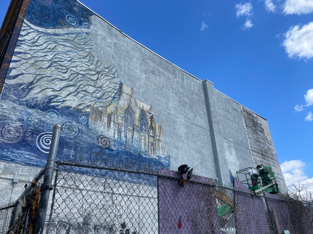 When I first saw it rise, I assumed someone was painting something quick on the wall while it was visible to the busy intersection. Kind of like how graffiti writers will tag a building that’s about to be torn down. I thought maybe, at best, the mural would last a few months. And that would have been the case if construction on the six-story building that was supposed to sit in front of it had moved along at a normal pace. But some initial neighborhood pushback (namely about the building of a Target) followed by the beginning of the pandemic in 2020 halted the project indefinitely.