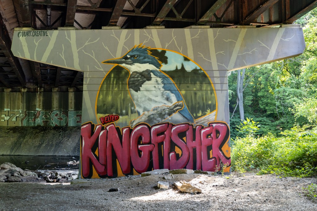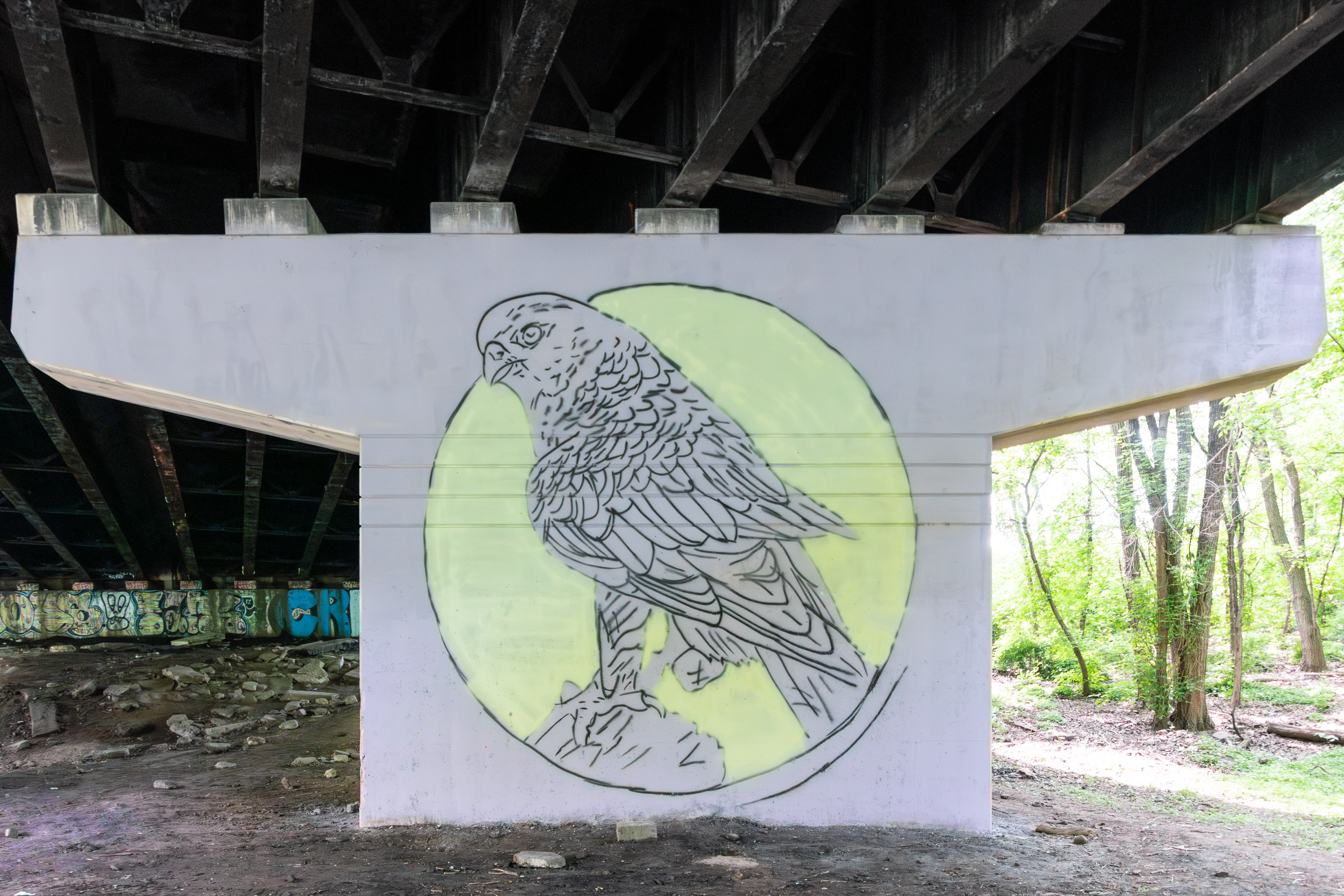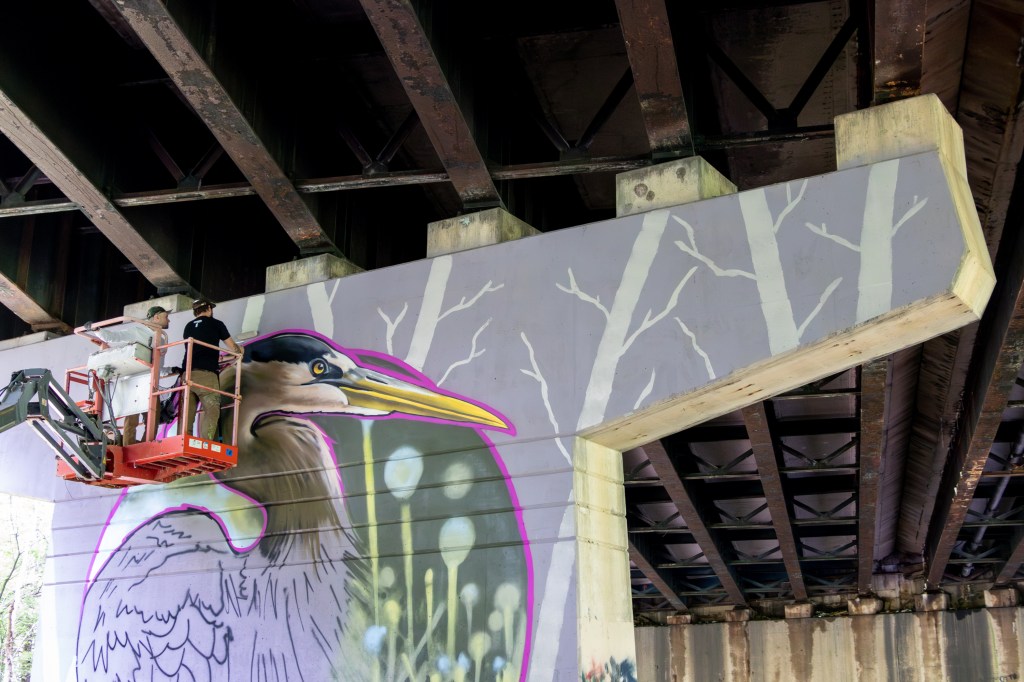 Murals depicting a great blue heron, belted kingfisher, white-breasted nuthatch, and peregrine falcon were originally painted by Evan Lovett and Frank Chappell through Evan’s mural nonprofit VURT Creative in 2019. I was on hand to photograph that installation, which you can see in these in-progress shots. These two artists work fast—these four murals took them just four days to complete!