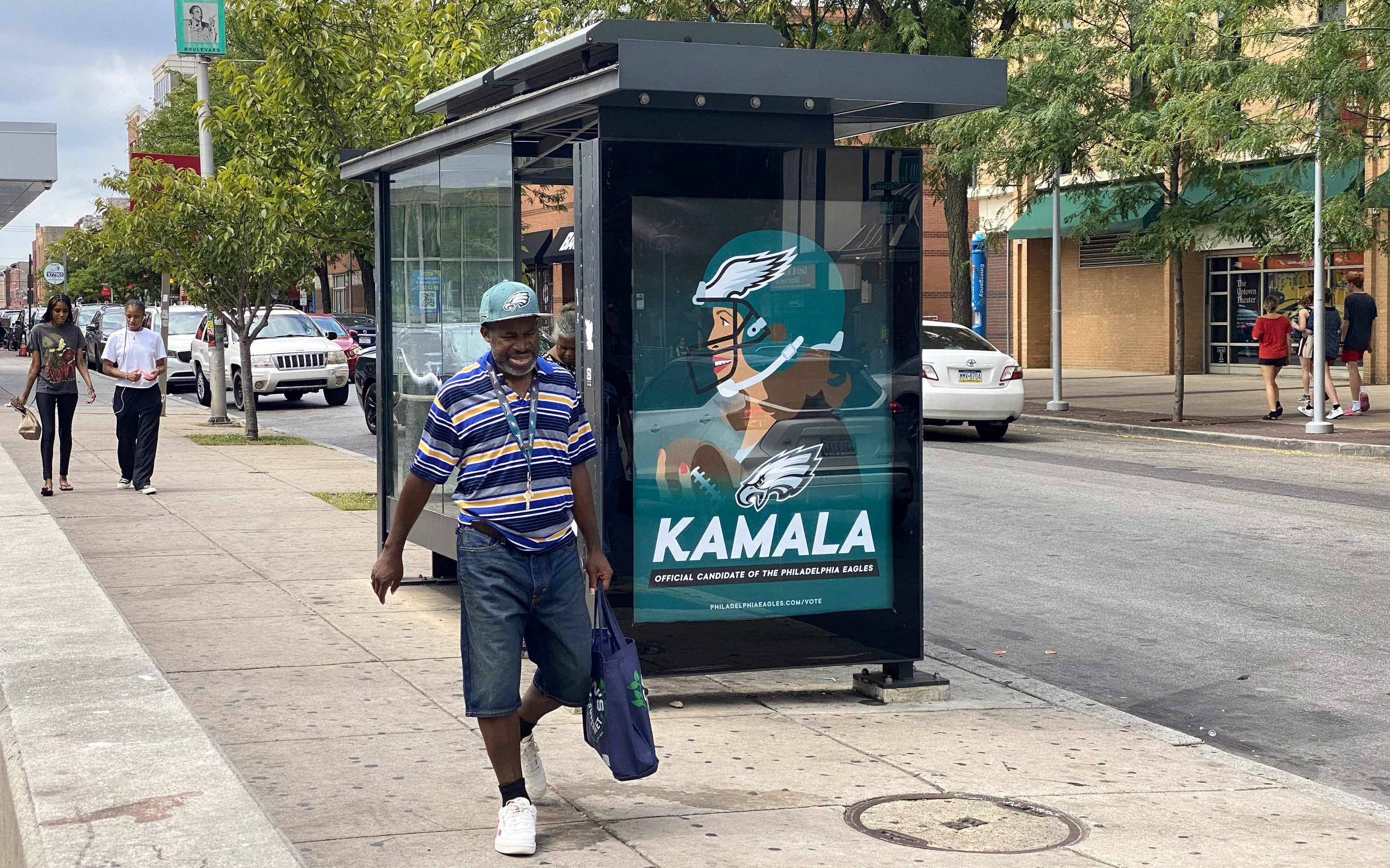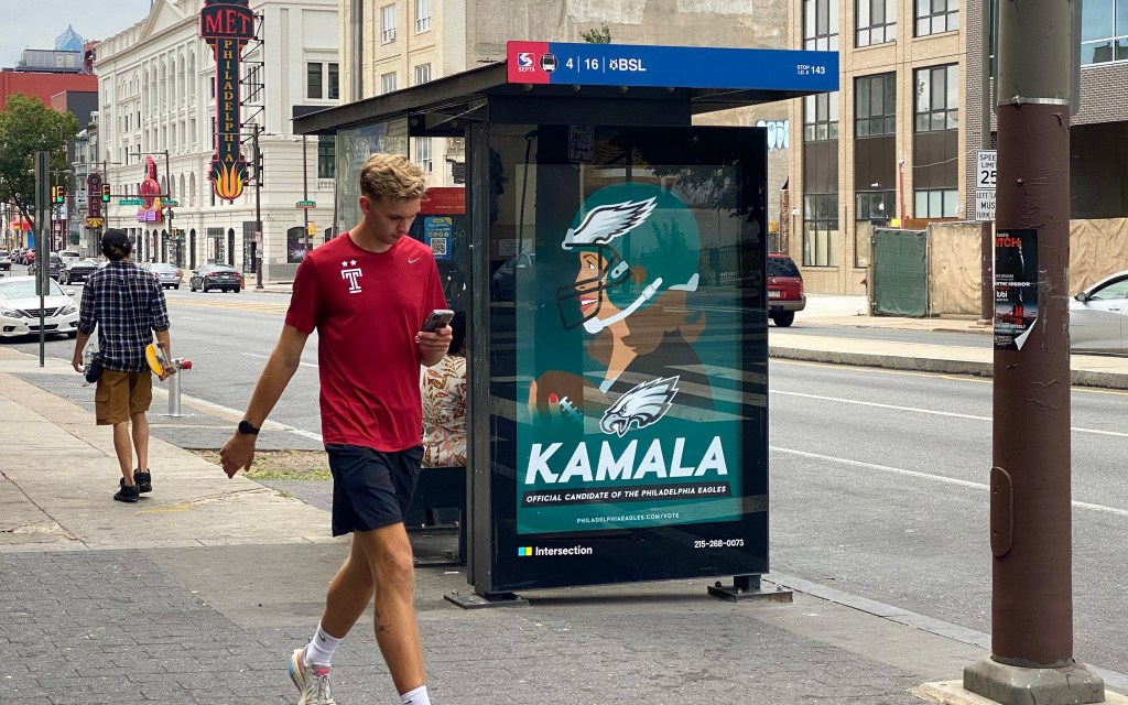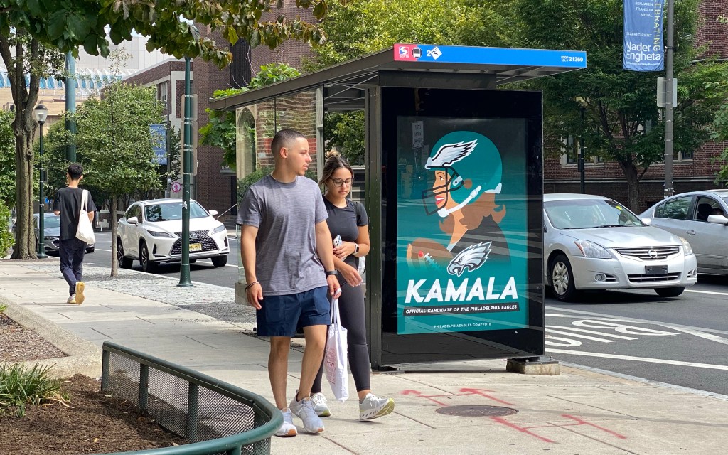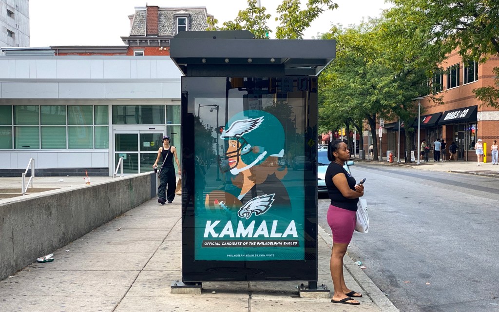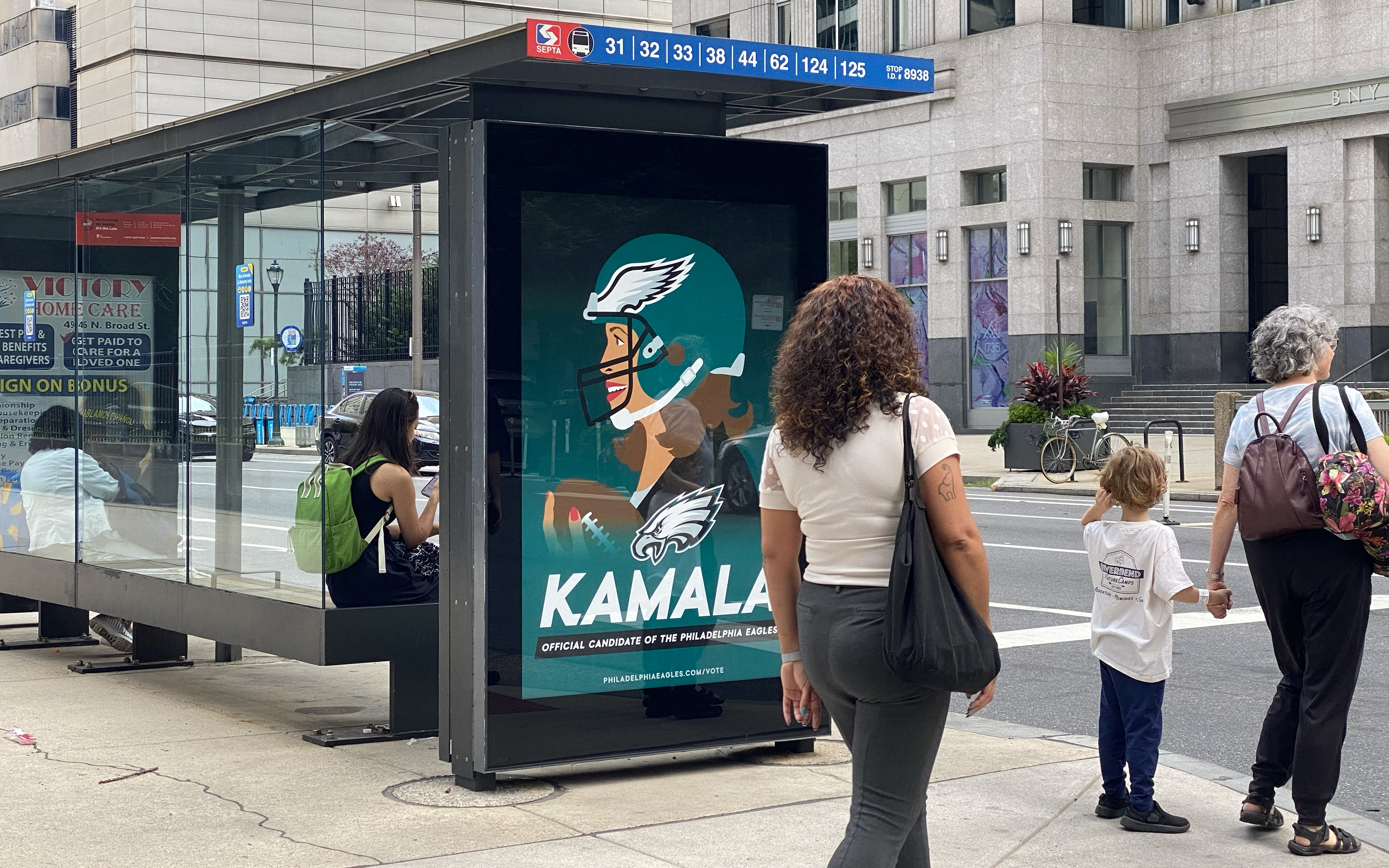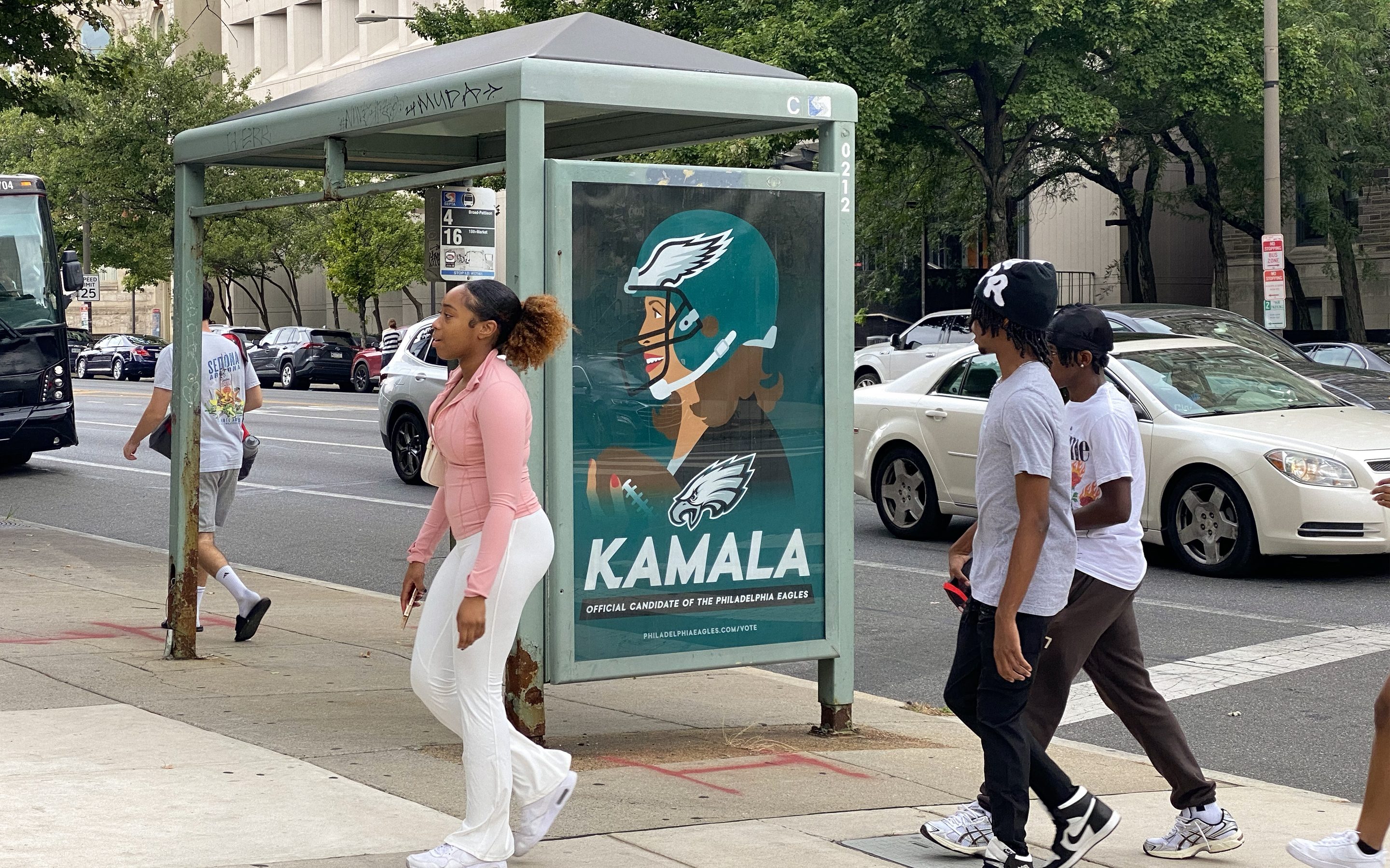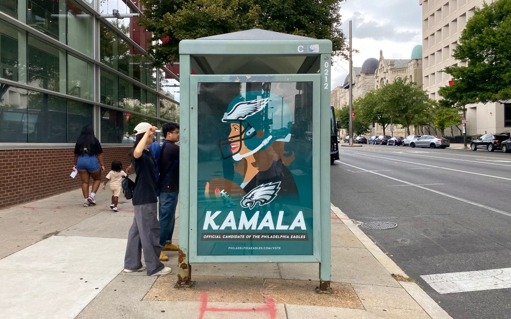 SD: About the artwork, what ignited this idea? Why this approach of having the Eagles appear to endorse Kamala Harris here in Philly? Were there other location organizations you were also considering? Other cities? Walk us through the birth of this idea!