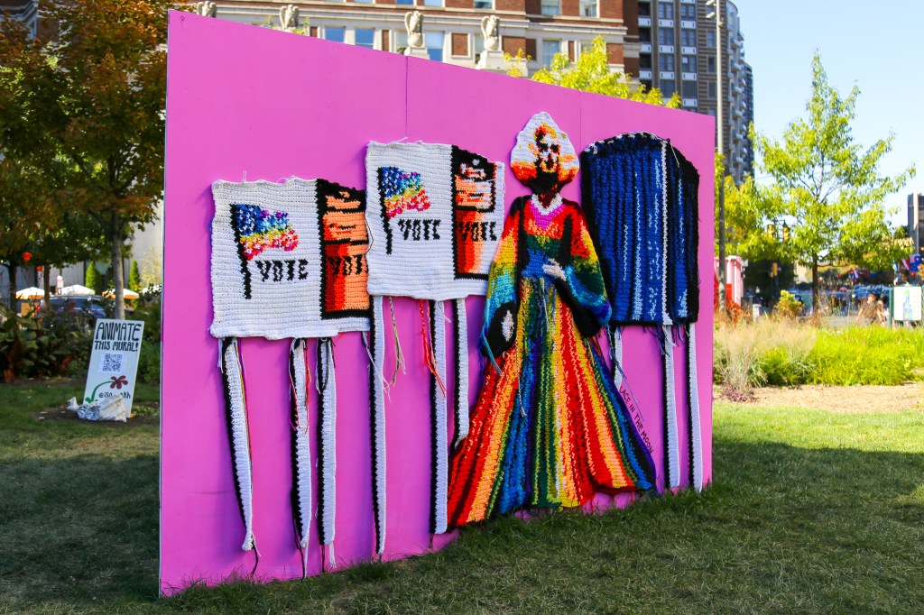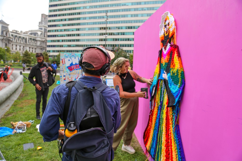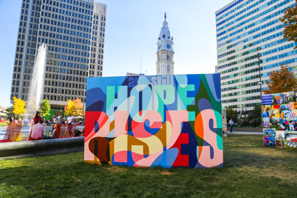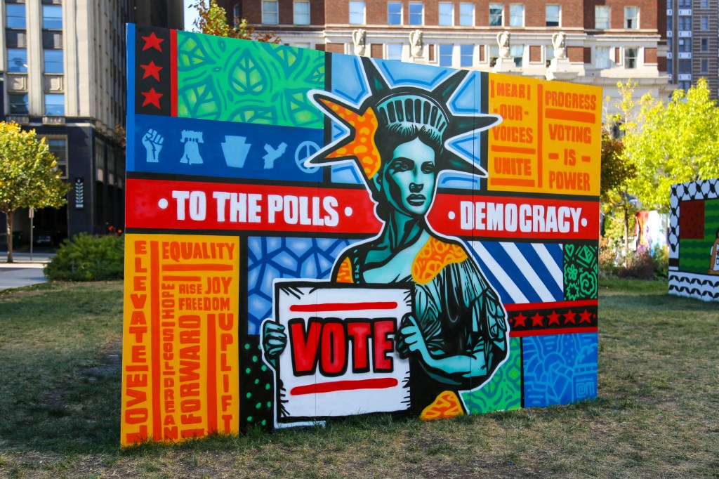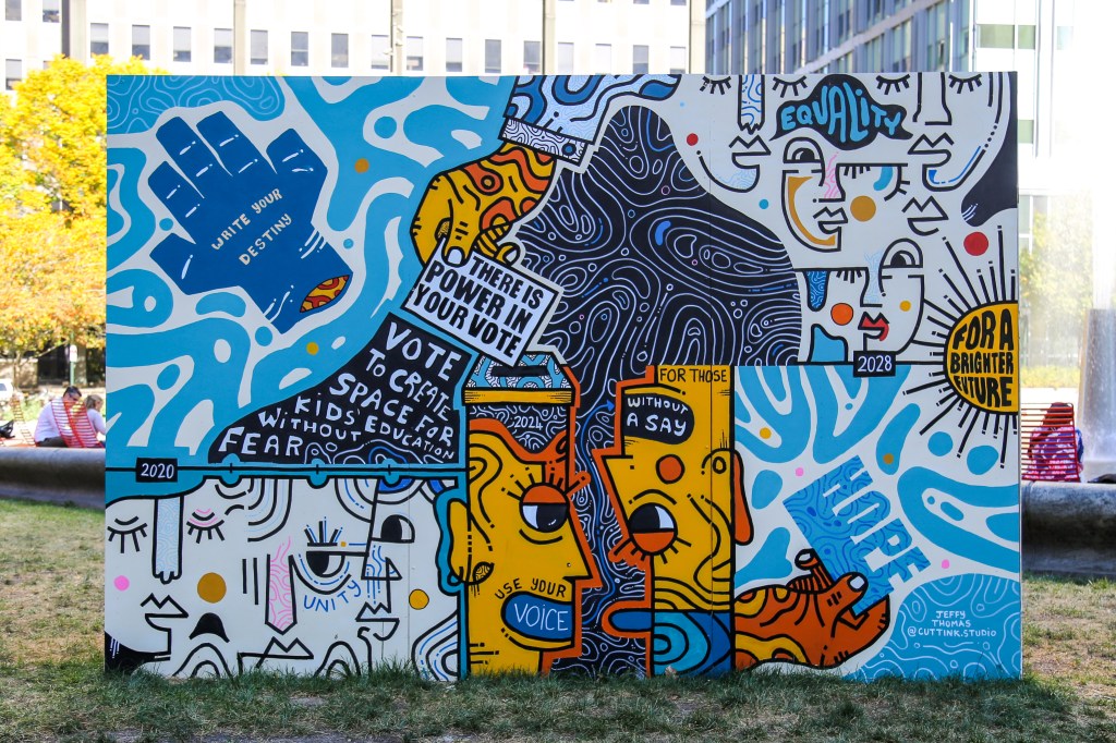 To The Polls 2024 is a temporary, voting-themed mural exhibition taking place in LOVE Park, Philadelphia right now–just ahead of Election Day on Tuesday, November 5, 2024. (And yes, it’s right next to The Portal.)