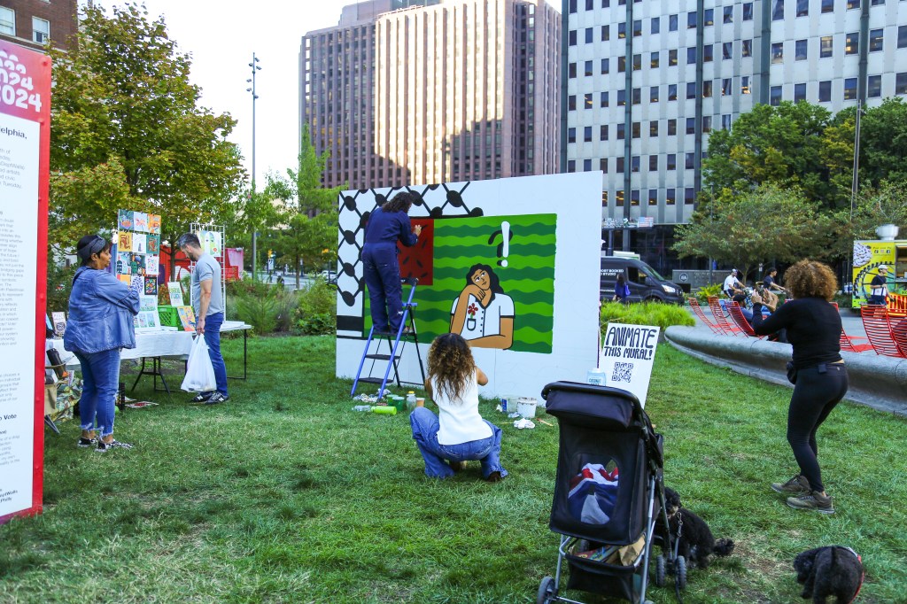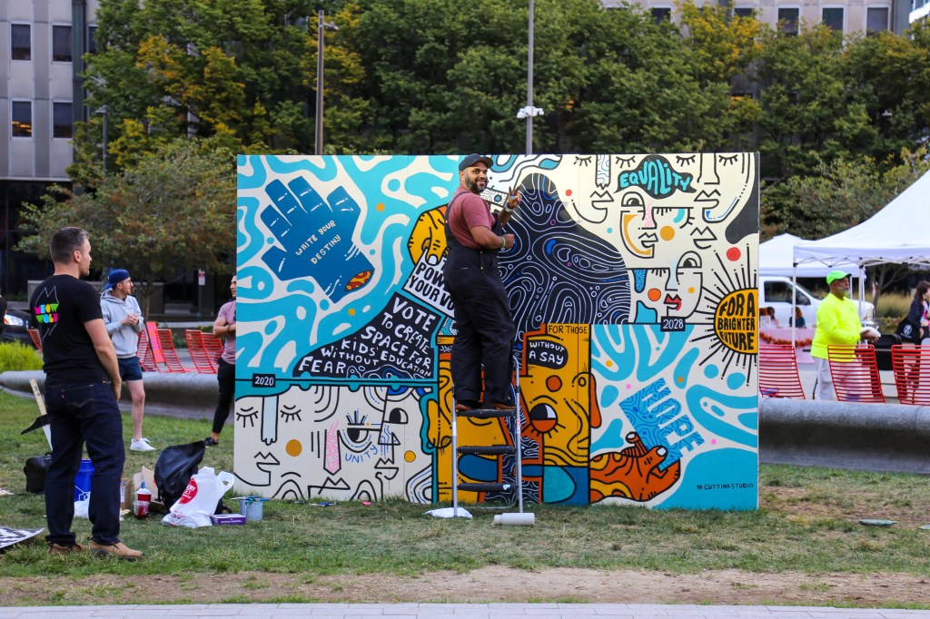 With Pennsylvania (and Philadelphia specifically) being so crucial to this election, I wanted to do something that captures the spirit of the Philadelphia streets during these crazy times, harkening back a bit to 2020 when people were dancing in front of City Hall and The Convention Center during the final vote counts. It looks highly possible for history to repeat itself, as far as the final counts coming down to the wire here in our awesome historical city. I’m also striving to keep this mural–and its depiction of Philadelphia–POSITIVE AND FUN to provide some relief to the often combative, dark tone of modern politics. And, most importantly, hopefully encourage people to COME OUT AND VOTE!