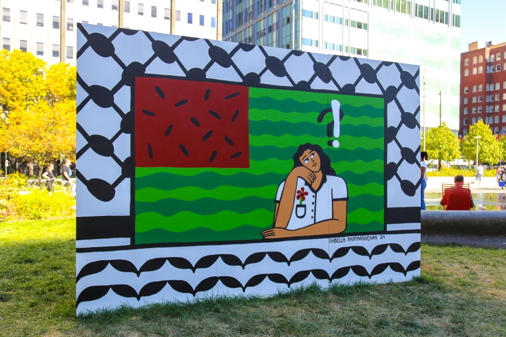 This piece illustrates the journey from doubt to conviction, where the question mark that once punctuated “Vote?” transforms into an exclamation: “Vote!” The work encapsulates this shift in my perspective, from questioning whether voting in an imperfect system could ever align with my values, to realizing the power of hope and civic engagement in influencing the future I want to see. Through vibrant imagery and bold symbolism, this mural seeks to convey not just the internal conflict but the possibility of bridging gaps between idealism and action. Central to this piece is the visual merging of two powerful symbols: the American flag and the watermelon. The watermelon, historically associated with Palestinian resistance, is interwoven with the flag to represent the intersection of personal convictions with national identity. This fusion of imagery reflects the tension between national participation and global solidarity, highlighting the ways in which these seemingly divergent identities can coexist and inform one another. Ultimately, “Vote? Vote!” represents a reclamation of voice and power—acknowledging the imperfections of our system while emphasizing the importance of showing up, speaking out, and voting with intention and purpose.