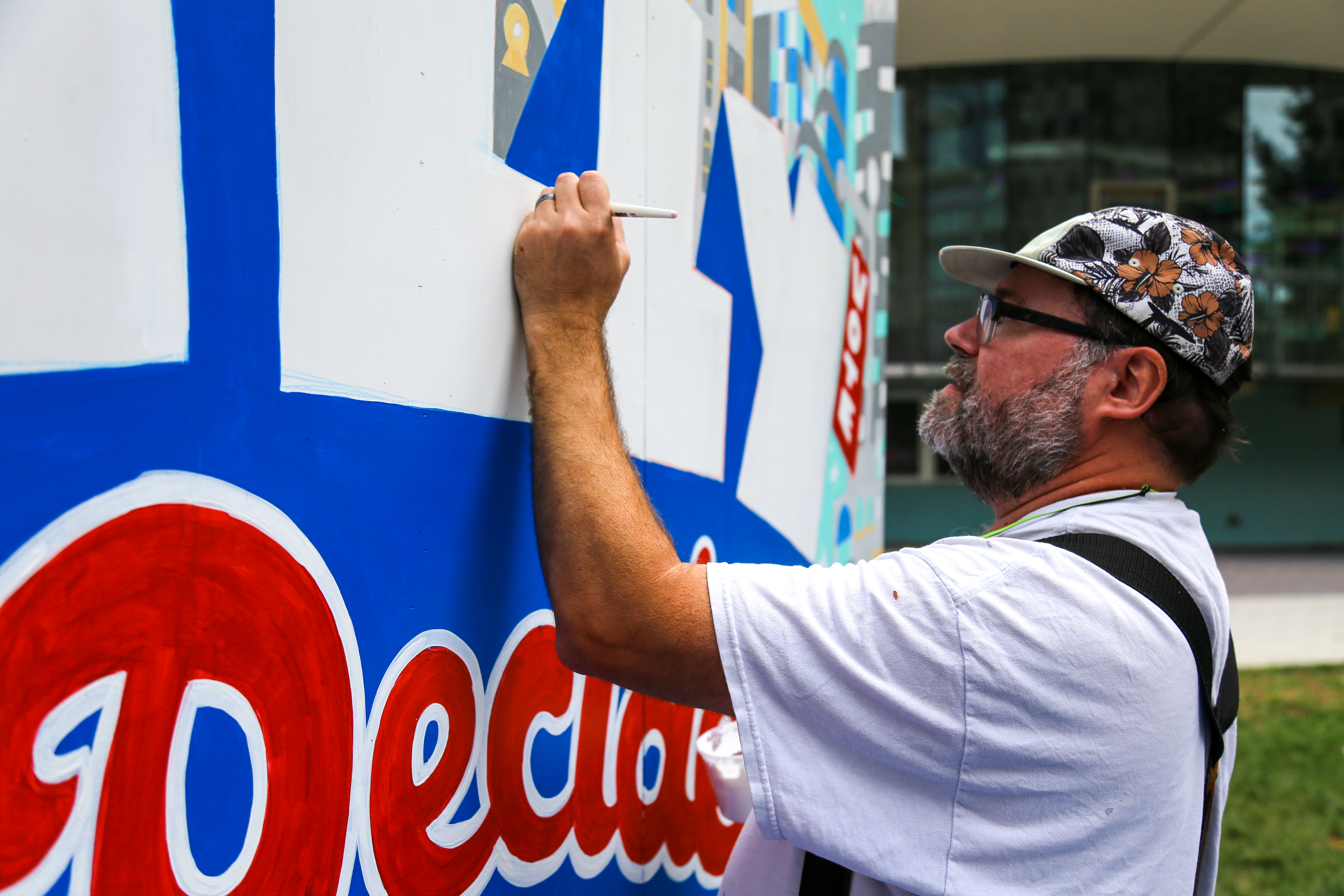 With Pennsylvania (and Philadelphia specifically) being so crucial to this election, I wanted to do something that captures the spirit of the Philadelphia streets during these crazy times, harkening back a bit to 2020 when people were dancing in front of City Hall and The Convention Center during the final vote counts. It looks highly possible for history to repeat itself, as far as the final counts coming down to the wire here in our awesome historical city. I’m also striving to keep this mural–and its depiction of Philadelphia–POSITIVE AND FUN to provide some relief to the often combative, dark tone of modern politics. And, most importantly, hopefully encourage people to COME OUT AND VOTE!