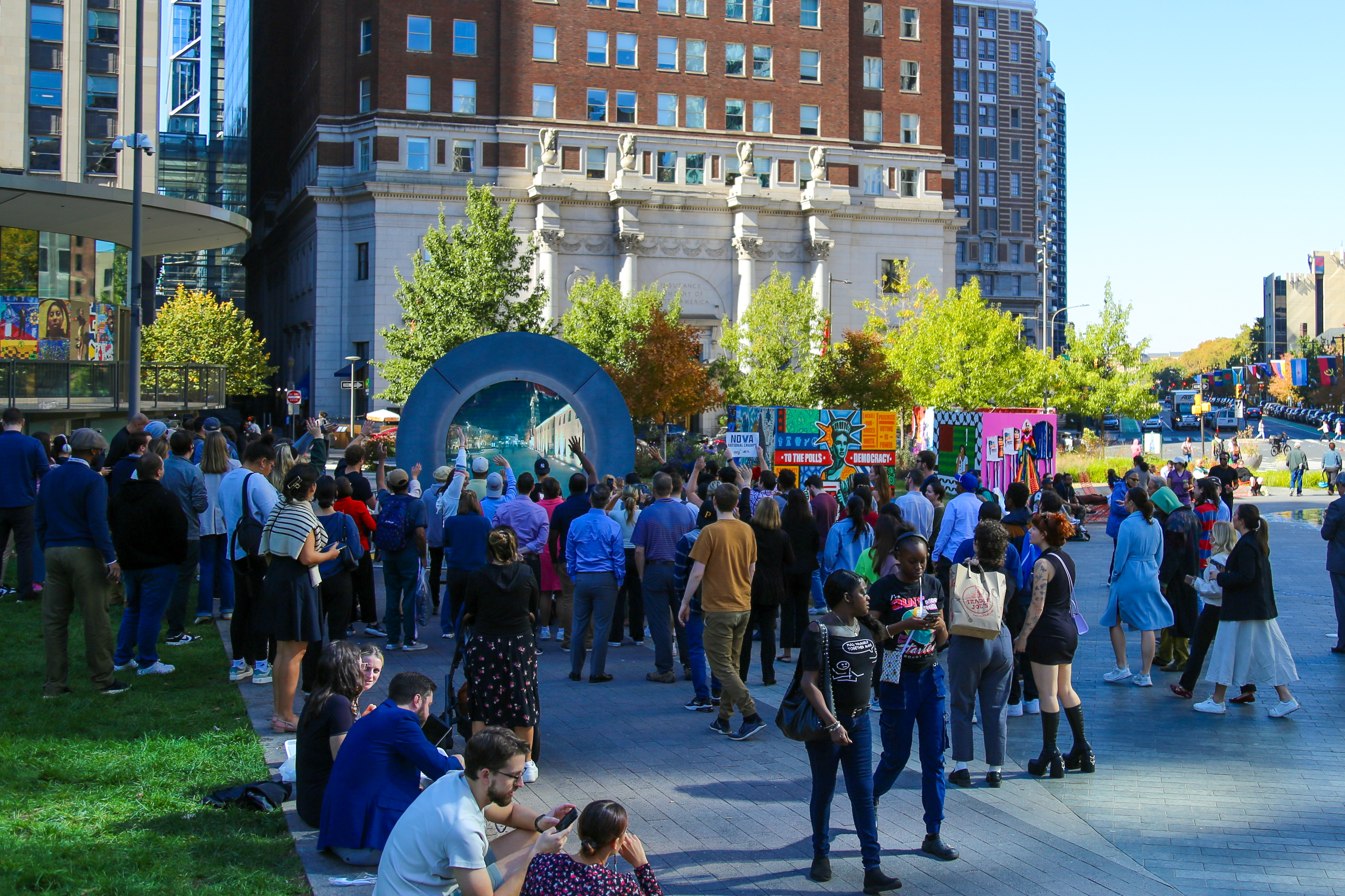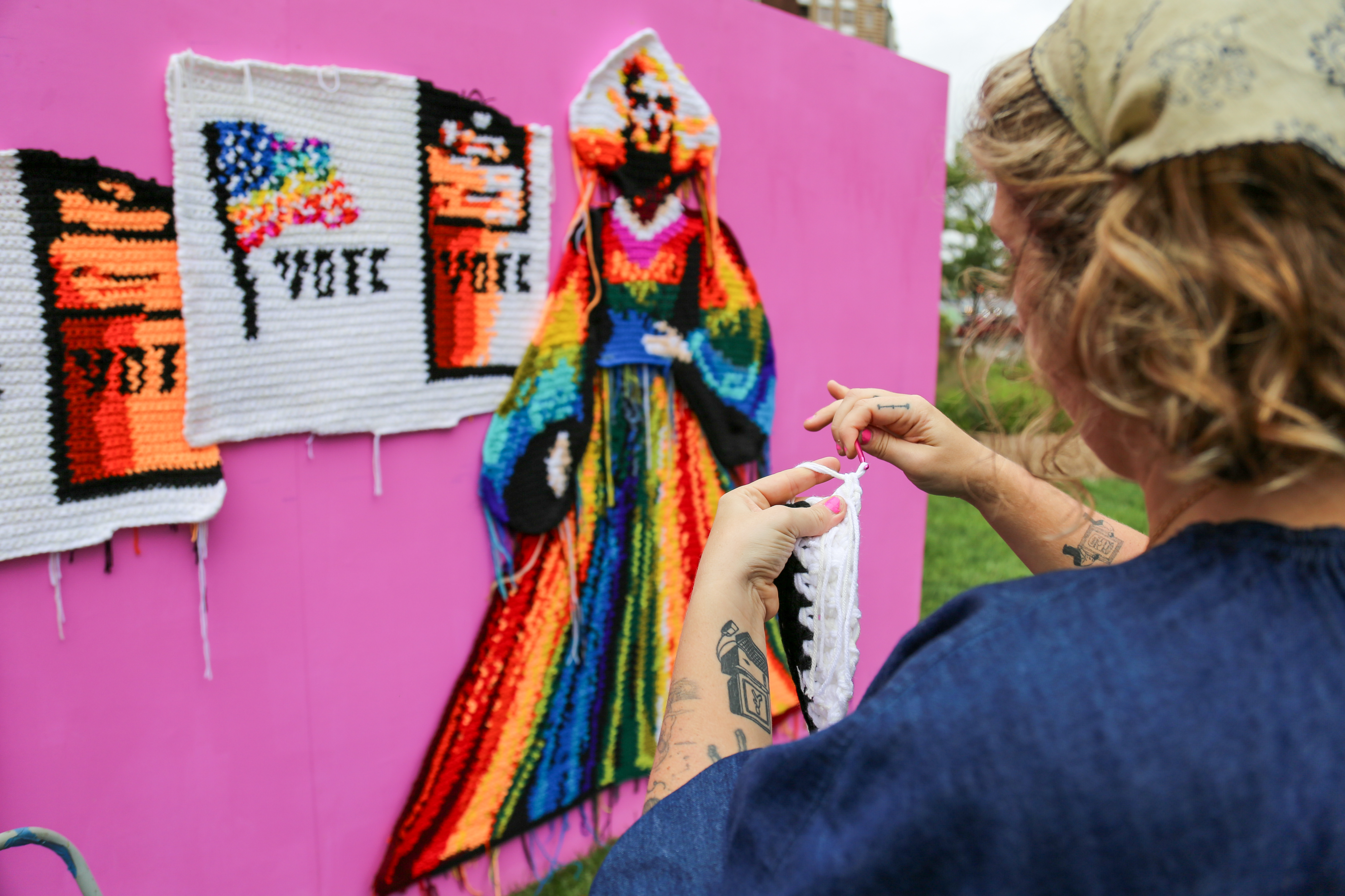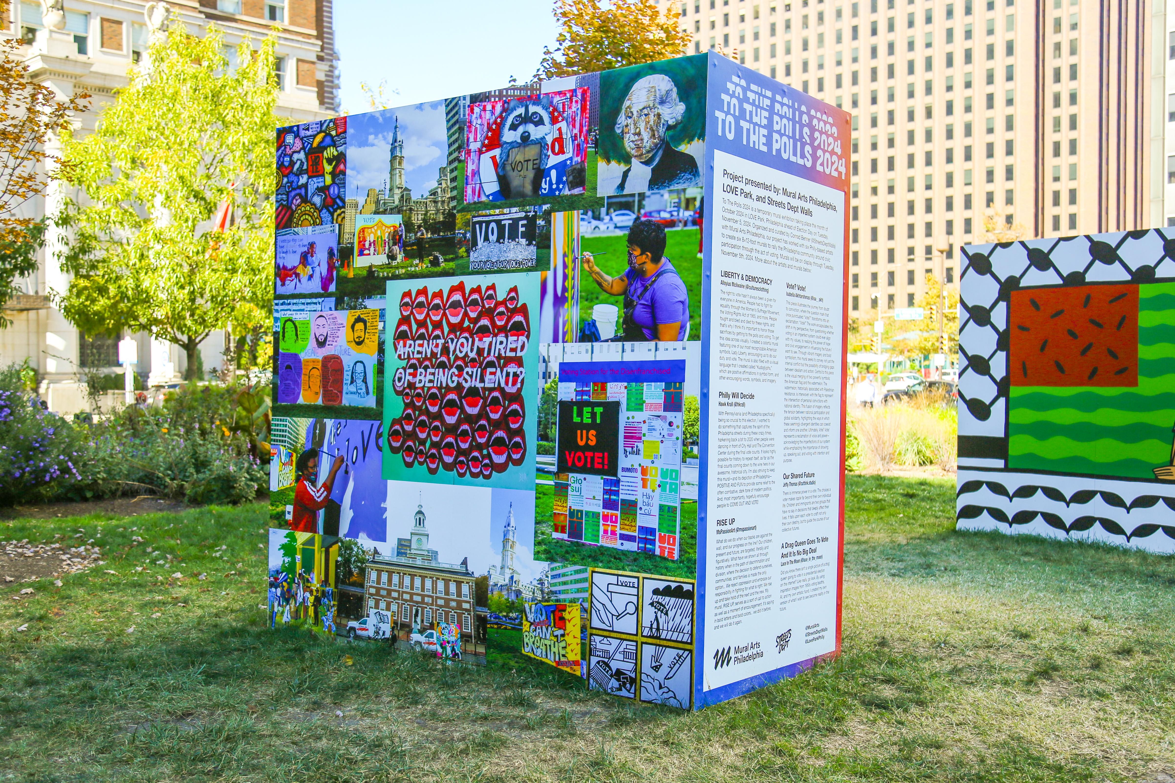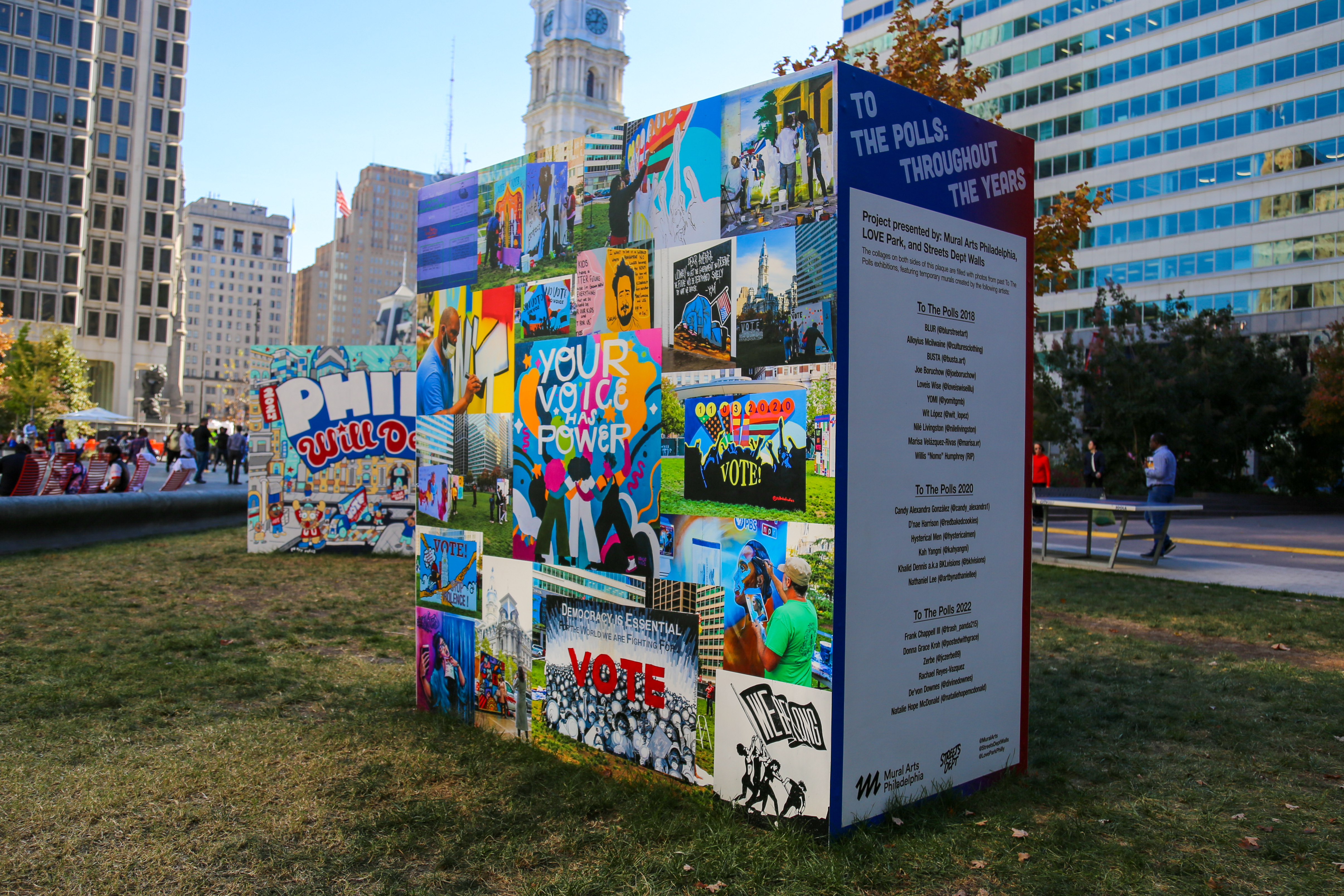 To The Polls 2024 is a temporary, voting-themed mural exhibition taking place in LOVE Park, Philadelphia right now–just ahead of Election Day on Tuesday, November 5, 2024. (And yes, it’s right next to The Portal.)